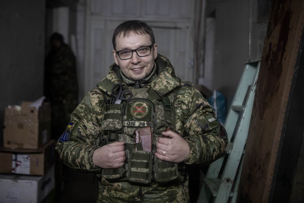 Qui incontriamo anche Sergey, mentre riposa nel corridoio. È un responsabile stampa per un battaglione. Incuriositi ci mettiamo a chiacchierare con quest’uomo che ci racconta di essere anche lui un volontario. Da dove provieni? «Da Kiev», risponde, «mi sono arruolato dal primo giorno». Cosa facevi prima? «Sono direttore dell’Orchestra filarmonica di Kiev», ci risponde con nostro grande stupore. «Ho scambiato le bacchette con il Kalashnikov. Il mio nome di battaglia è «Maestro», come il grande Riccardo Muti! Do il mio sostegno qui in prima linea per poter ritornare a lavorare un giorno in teatro».