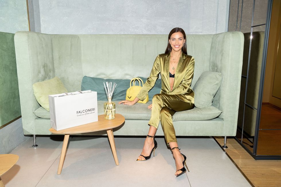 - In pigiama anche di giorno, purché sia di seta. Irina Shayk ospite in showroom da Falconeri accoglie i visitatori con un pigiama verde in seta e un reggiseno nero in mostra.