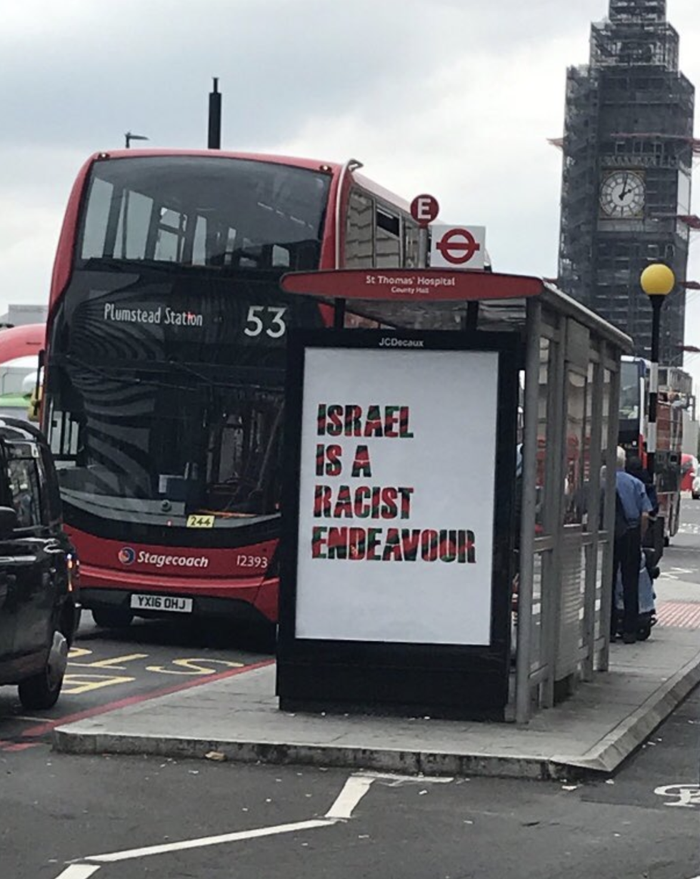 Un paio di giorni fa, di notte (i londinesi se ne sono accorti all'alba), in prossimità delle stazioni di Westminster, Waterloo e Bloomsbury, sono stati affissi poster con lo slogan "Israele razzista". La cosa singolare - le foto parlano chiaro - è che non si è trattato di affissioni pasticciate e dilettantesche, ma di poster affissi a regola d'arte, sia pure clandestinamente e senza autorizzazione. I manifesti sono stati ovviamente rimossi: erano stati affissi dai militanti filopalestinesi del gruppo London Palestine Action per protestare contro la decisione del Partito Laburista, presa la scorsa settimana, di accettare nel proprio codice di condotta la definizione di antisemitismo decisa dall'International Holocaust Remembrance Alliance.
