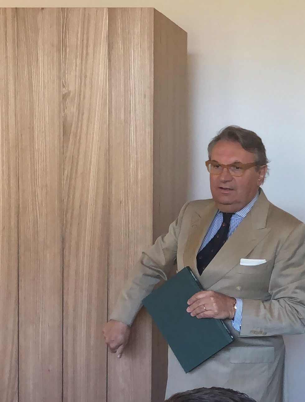 «È un'invenzione straordinaria, avevo questa scintilla da tempo. È un guardaroba intelligente, tecnologico che si ispira al dannunziano “Armadio dell'uomo moderno". Abbiamo portato la nostra cultura all'interno di questa cabina che è poi la cabina di un arbiter elegantiarum. Persone che acquistano le stoffe per poi andare dal sarto e hanno una cura maniacale nel riporre la giacca su una gruccia con la misura perfetta delle proprie spalle, devono anche avere il luogo perfetto per appendere abiti eterni, non usa e getta, che mai devono essere pressati tra di loro. E all'interno, una parte speciale: il refresh butler di V zug. I capi vengono rinfrescati neutralizzando gli odori, riducendo le pieghe, e vengono anche asciugati e igienizzati».