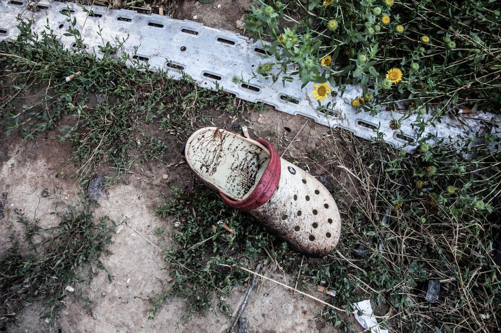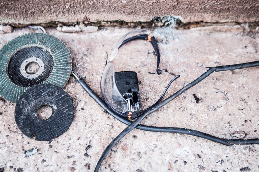 A terra rimangono ancora le scarpe, le ciabatte intrise di sangue, una delle barelle utilizzate per l’evacuazione anch’essa intrisa di sangue, gli attrezzi con i quali stavano saldando delle piastre al mezzo da riparare.