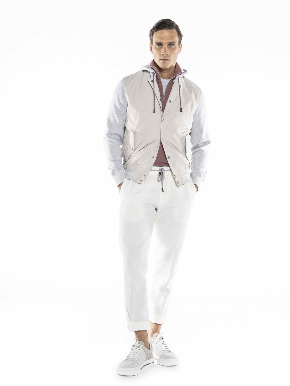 «Un garbo che ritroviamo anche nello sport. Mancini lo dimostra. Tutti i ragazzi sono curati, fanno gol e non vanno a sbraitare, esultano con un certo comportamento. Quando ci guardano da fuori vedono un'Italia diversa. Guardando le imprese italiane, ahimeè abbiamo perso, ma stiamo andando avanti positivamente. Il manufatto di basso livello non è più di nostra competenza e quello ci ha portato via un po' di lavoro». Brunello Cucinelli, comunque, risponde con un prodotto, come sempre, di altissima qualità che parte dalla semplicità, dal piacere di ritrovare il gusto per l'eleganza e il ben vestire. L'abito, simbolo per antonomasia di eleganza, è reinterpretato in una chiave fresca e disinvolta con giacca spezzata e pantaloni dalle linee leggermente ammorbidite in fibre naturali, dai classici cotoni ai lini estivi sino alle preziose tele di lana vergine. La qualità prima di tutto.