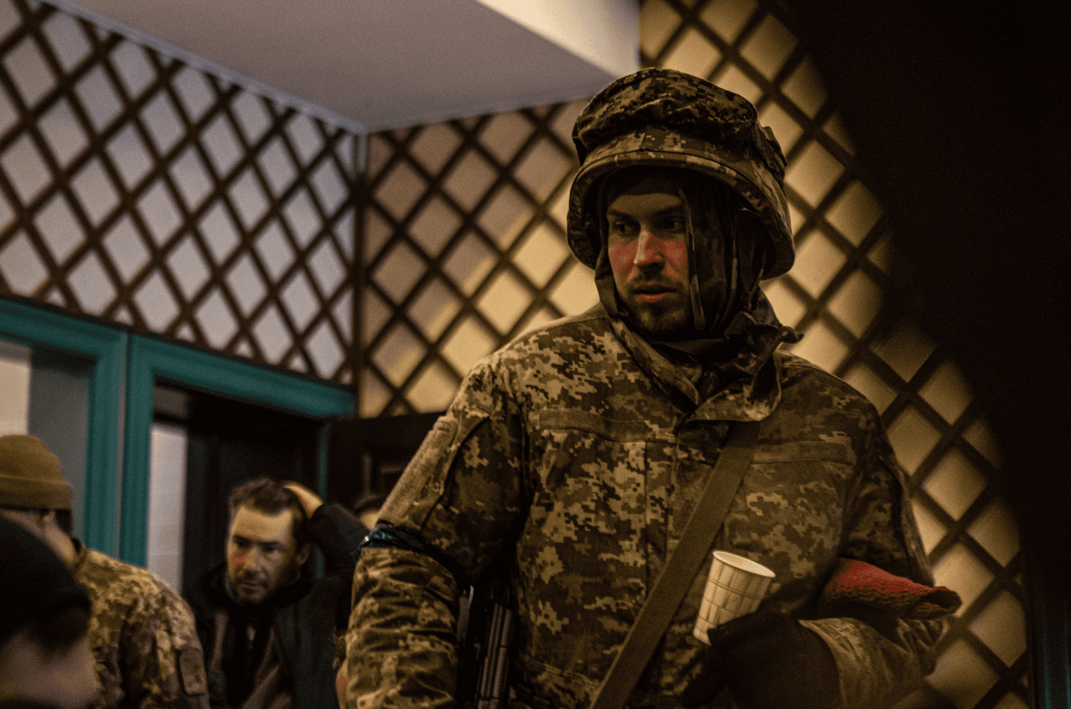 Qui al fronte non si vedono gradi e non ci sono atteggiamenti di superiorità, sì capisce chi comanda solo dall’atteggiamento degli altri, non si arriva mai a dare ordini ci racconta Ivan. Ivan è un ufficiale dell’esercito di 30 anni, un ragazzone alto quai 2 metri, con il viso pulito gli occhi profondi e sempre scherzoso, è nell’esercito dal 2014, «sono stato 5 anni in Lugansk, ora sono qui a difendere Kiev». Il suo ruolo è quello di organizzare la logistica e i posizionamento di trincee e postazioni di difesa. Non porta una divisa con i gradi, un casco, il fucile, indossa un giaccone ed è costantemente accerchiato da tre-quattro militari che ne seguono le direttive, comunica con due cellulari e le radio con il comando superiore, è lui che ha la responsabilità di tutti, infatti quando gli parliamo degli ultimi ragazzi morti nella notte la sua faccia sempre sorridente per un attimo si irrigidisce. Quando abbiamo la possibilità di scambiare con lui alcune parole è seduto dietro alla seconda linea di trincea su un tronco tagliato in mezzo al bosco, si sentono ben vicine le esplosioni ma lui non ci fa caso, sta lì e tra una domanda all’altra risponde ai continui messaggi della radio.