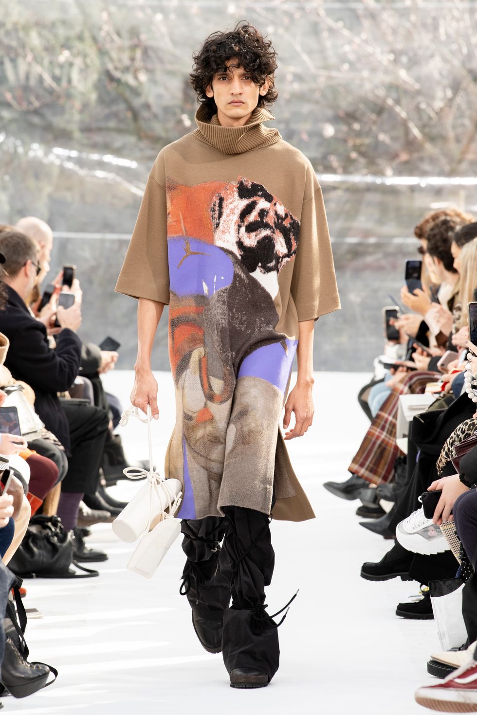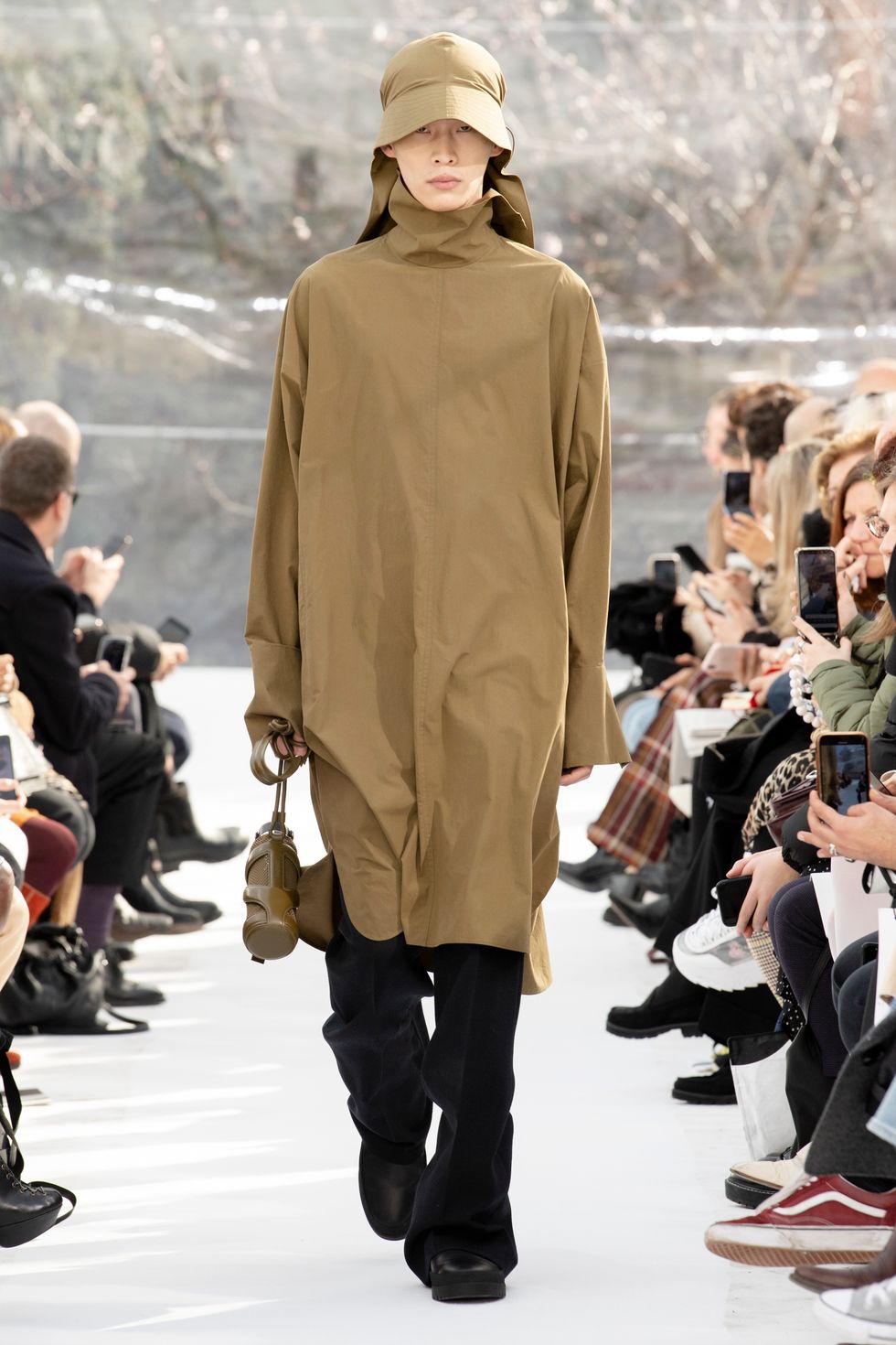 Jonathan Anderson, dal 2013 direttore creativo di Loewe, marchio spagnolo nato nell'alta pelletteria e nel portafoglio del Gruppo Lvmh, ha presentato forme austere ed esagerate che ogni volta conquistano il pubblico per la loro unicità. «Stavolta mi sono ispirato al Giappone e alla sua cultura» racconta Jonathan Anderson che ha inserito negli abiti e negli accessori dei pezzi di ceramica dell'artista Takuro Kuwata. E alle forme giapponese si ispirano le grandi maniche di certi vestiti, i colletti scultura, i pantaloni legati all'orlo, i pantaloni che ai lati sembrano avere le ali. Magnifiche le scarpe che ti vorresti subito mettere col fiore sul cinturino, belli i secchielli color cuoio, le ampiezze esagerate delle gonne che sfiorano terra. Nessun gioiello addosso alle modelle per non rompere l'incanto/incantesimo di Loewe. I volumi sono estremi, sospesi, cascanti e minuziosamente studiati. Maniche rigonfie. Scollature rialzate. Colletti scultorei. Corpetti lisci ed esplosioni di volume nei drappeggi. E all'improvviso, l'isteria di un copricapo piumato.