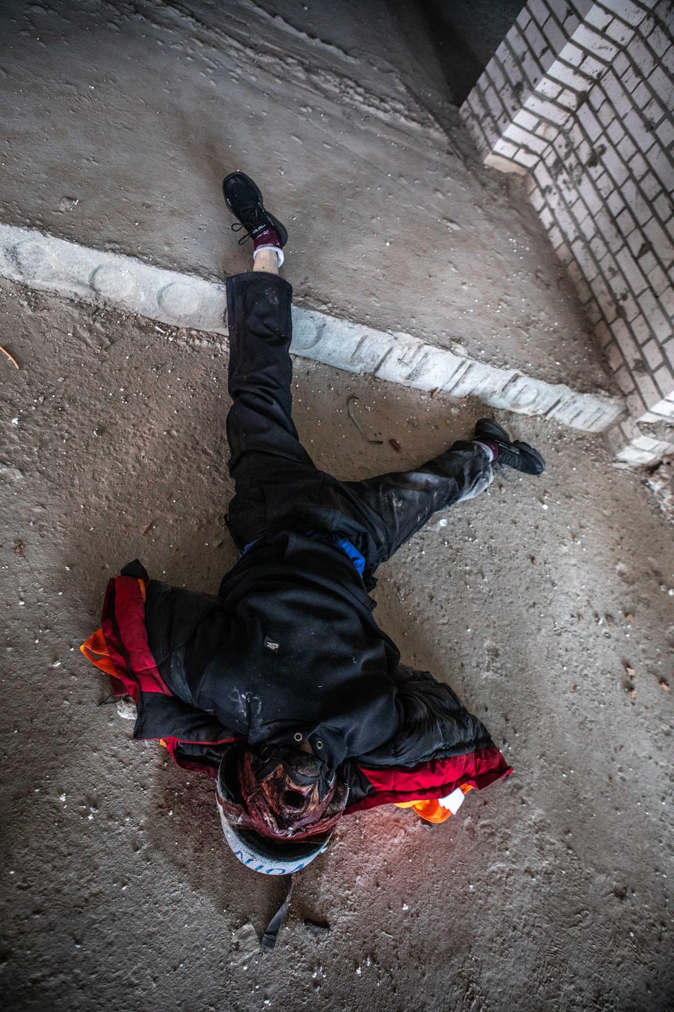 Lo troviamo all’interno di un magazzino, dopo che un signore ci aveva detto di «andare a vedere cosa hanno fatto i russi». Quando entriamo, passando da una vetrata andata in frantumi, il corpo giace irrigidito, il casco è allacciato, la bocca spalancata. I denti non si vedono, sugli occhi ha una benda completante intrisa di sangue, così come c’è sangue rappreso sotto la sua testa. Sotto la benda pare non avere gli occhi. Alcuni poliziotti che arrivano poco dopo sul posto ci dicono che potrebbe essere morto dissanguato proprio per l’asportazione di lingua e bulbi oculari. I poliziotti ci fanno cenno di allontanarci dal corpo, lo analizzano e poi indietreggiano improvvisamente: «Può avere una bomba, fuori tutti!», gridano. Prendono un arpione attaccato a un filo che usano per trascinare i feriti in battaglia, per aprire botole e porte che possono essere minate e per spostare i morti o gli involucri di ogni tipo a cui spesso vengono attaccate mine o bombe di vario tipo. Lo agganciano e poi srotolano la cima fino a fuori dalla struttura al riparo. Tirano il corpo. Non succede niente, l’allarme è rientrato. Arriva una squadra di militari del 206° battaglione. Parlano davanti al corpo. Alcuni di loro hanno le facce sconvolte. Intorno sono tutti sbigottiti, ma non è quel singolo corpo a fare questo effetto, è tutta la città, con le scoperte che vengono fatte di ora in ora, tra le macerie, negli scantinati dei palazzi, negli appartamenti, sulle strade: centinaia di corpi raccolti con le mani legate e i proiettili nel cranio, decine di racconti di persone che hanno visto giustiziare anziani seduti sulle panchine da carristi durante la fuga. Ma non è solo questo.