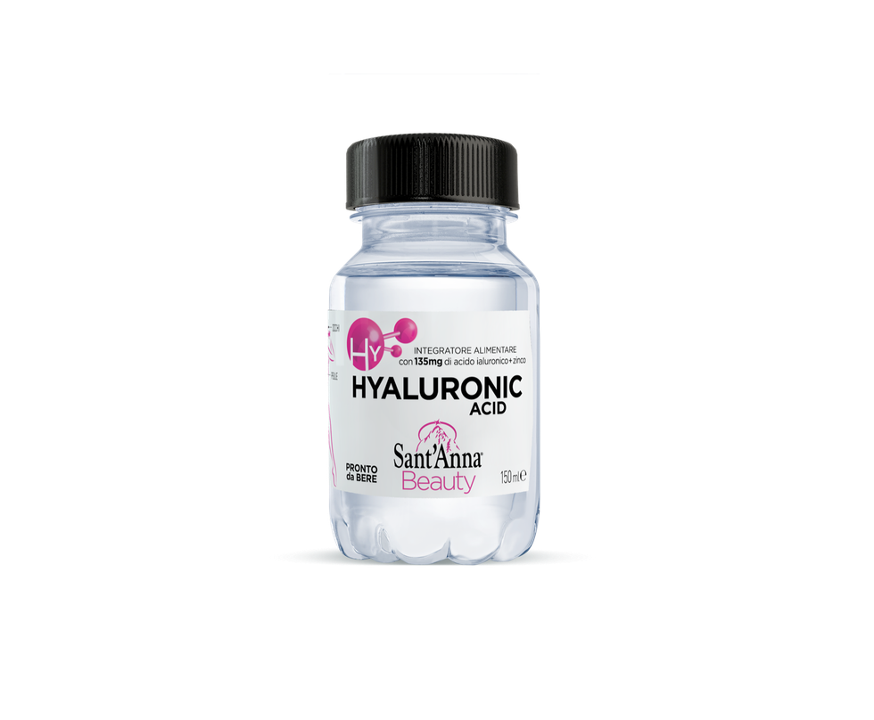 Per l'estate 2020 la linea Sant'Anna Beauty si arricchisce di tutti i benefici dell'acido ialuronico, una molecola che è presente negli occhi, pelle, articolazioni e tessuto connettivo, capace di legare l'acqua, preservando l'idratazione dei tessuti e la lubrificazione delle articolazioni. Con l'avanzare dell'età, tuttavia, la sua concentrazione nei tessuti diminuisce e così la progressiva comparsa di rughe e inestetismi. Studi scientifici hanno dimostrato che l'assunzione di acido ialuronico: aumenta l'idratazione; diminuisce la profondità delle rughe; migliora la lucentezza e la morbidezza della pelle.