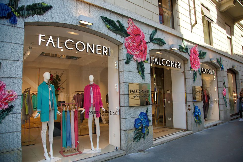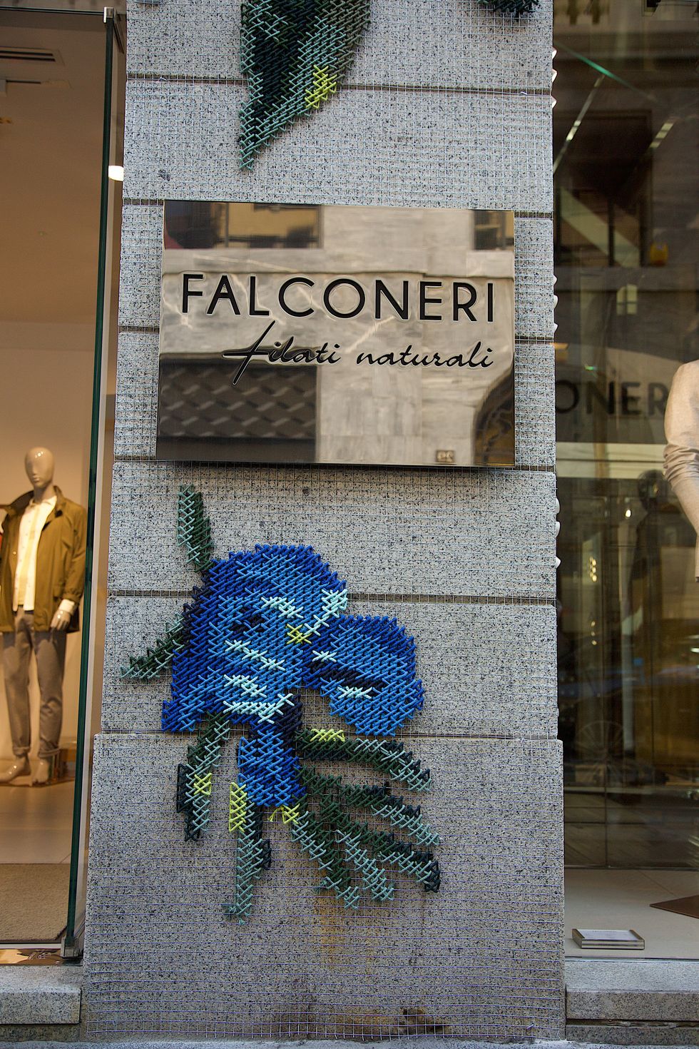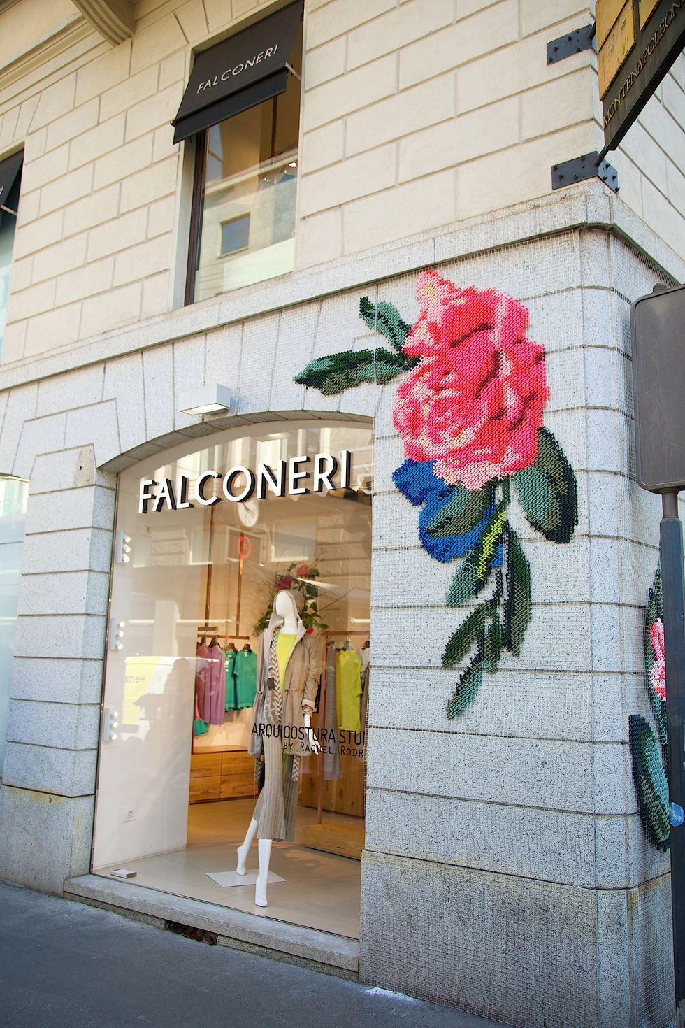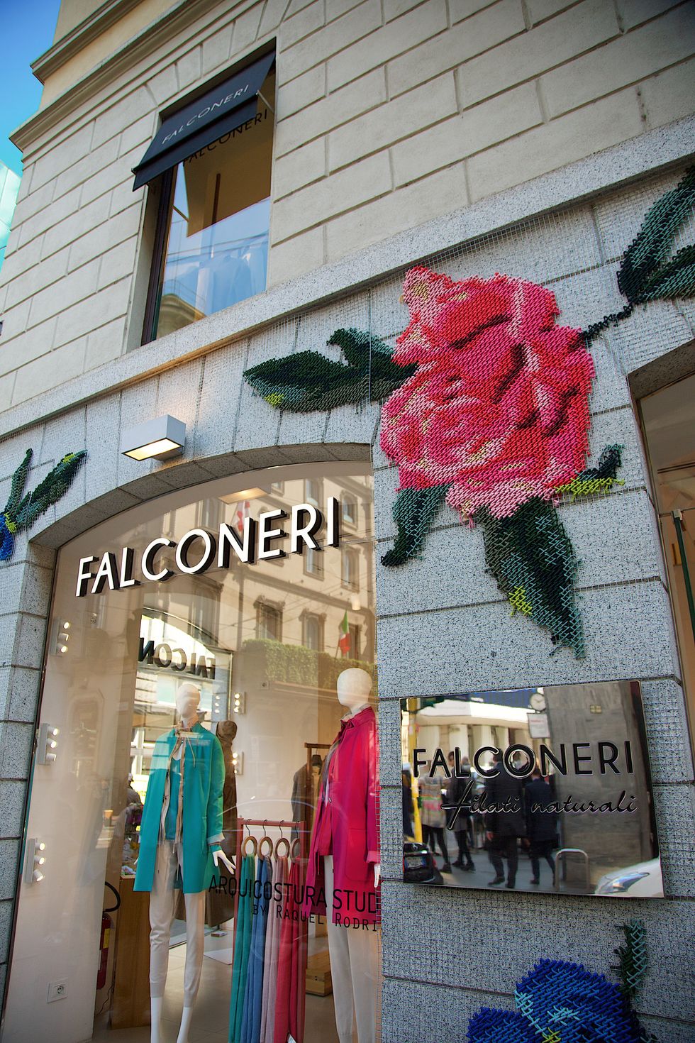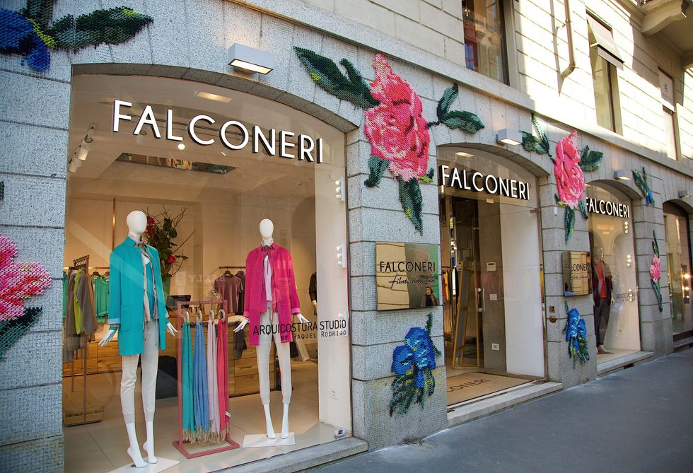 Falconeri è conosciuto in tutto il mondo per i suoi filati naturali. Specializzato nel cashmere, questo marchio italiano si è negli anni trasformato in un punto di riferimento per il mercato del lusso made in Italy. In occasione della Milano Design Week, lo store di Montenapoleone, angolo via Manzoni si è arricchito delle opere della designer valeriana Raquel Rodrigo. Il suo è un racconto dalla trama suggestiva, un vero e proprio intreccio di antiche tradizioni attualizzate. Così, grazie alla partnership con Falconeri, l'arte del ricamo si trasforma in un'opera monumentale. Un vero e proprio giardino incantato, con maxi fiori sui toni del rosa e del blu, incornicia le vetrine del negozio. «L'idea è quella di trasformare una forma d'arte intima in street art accessibile a tutti» spiegano. Le mura della città si fanno tessuto diventando tridimensionale e tattile.