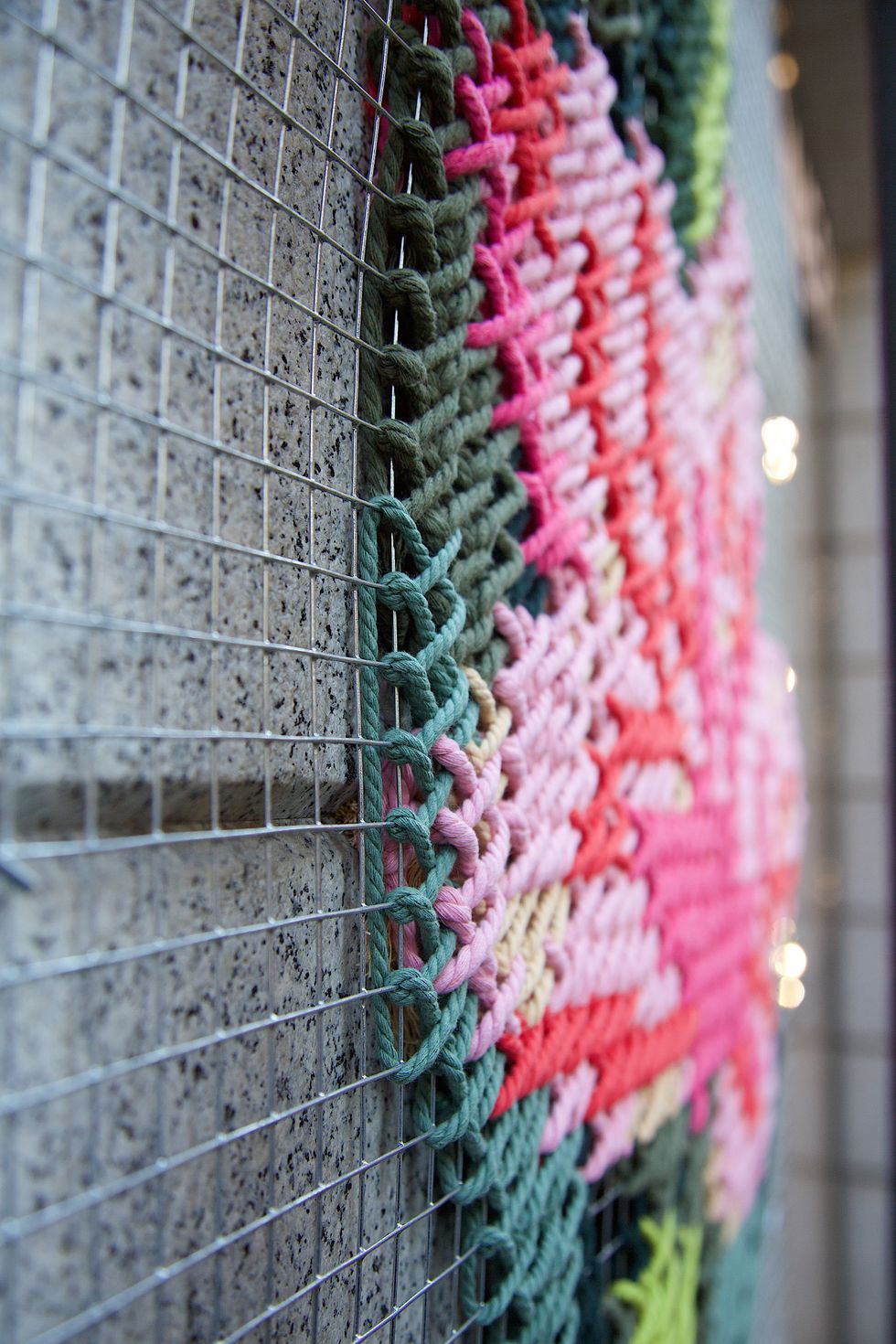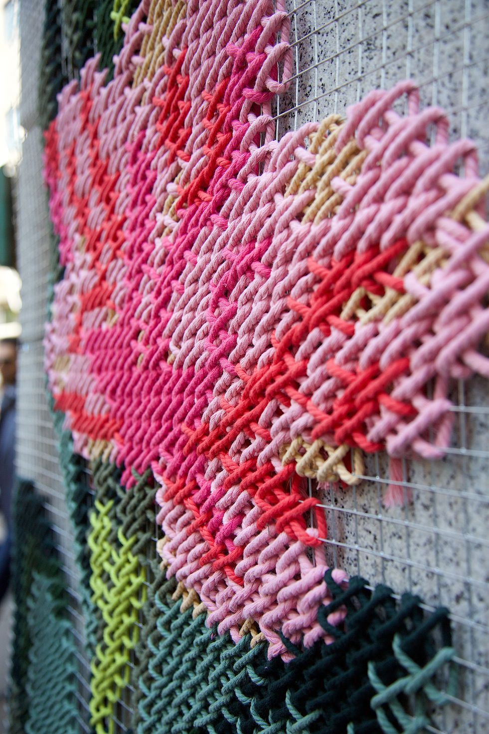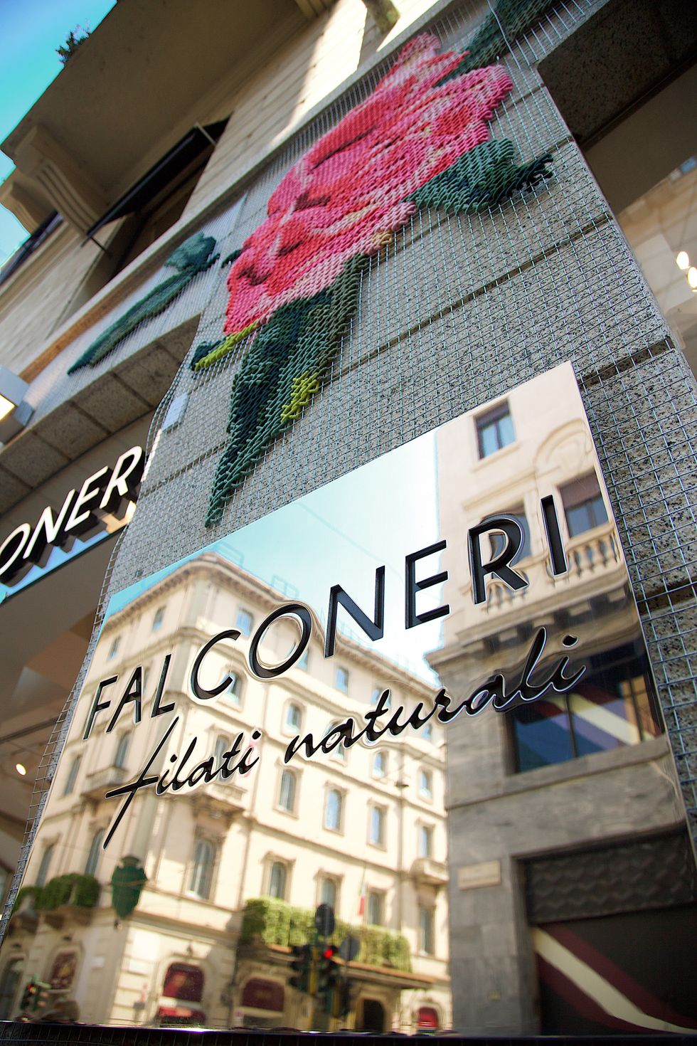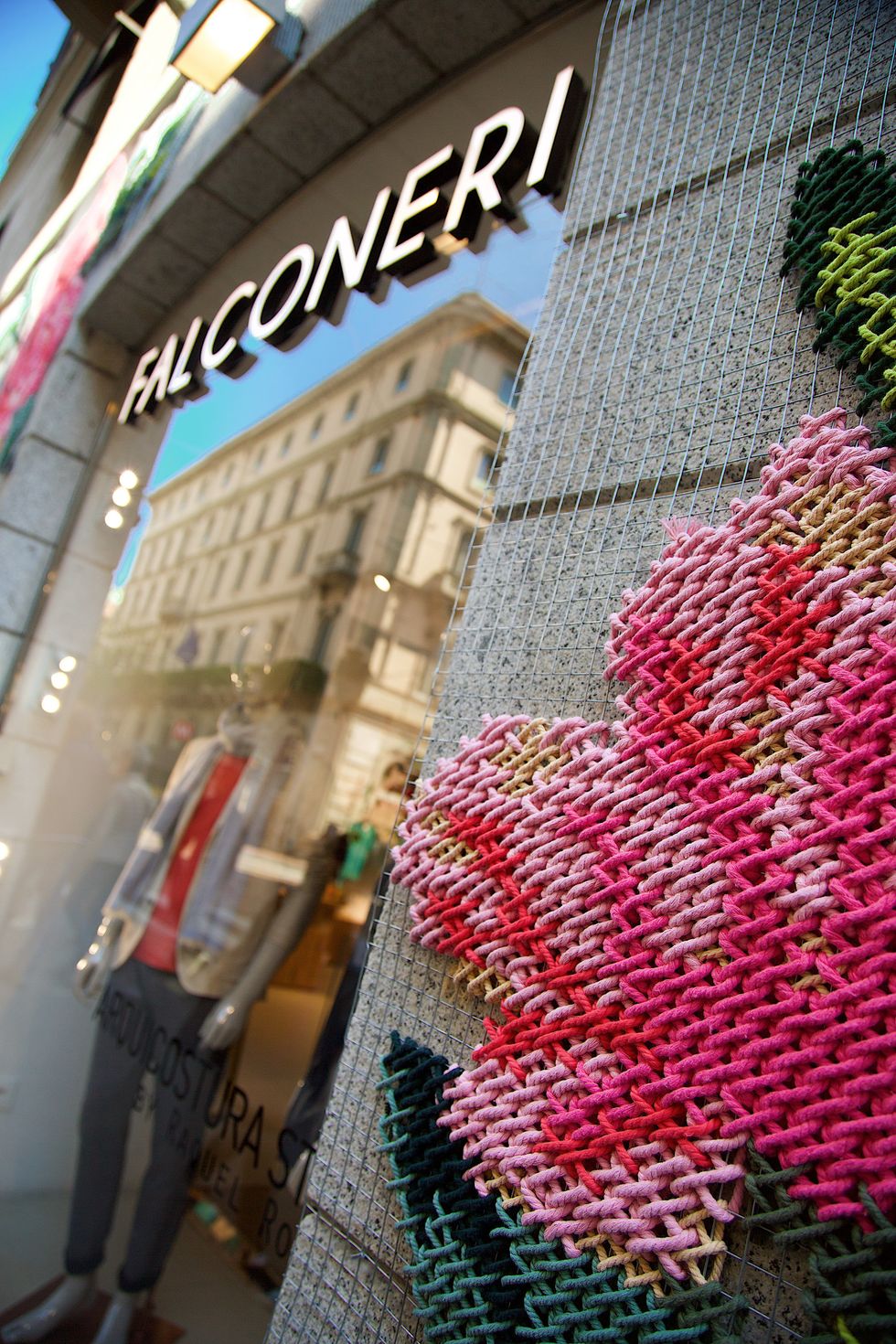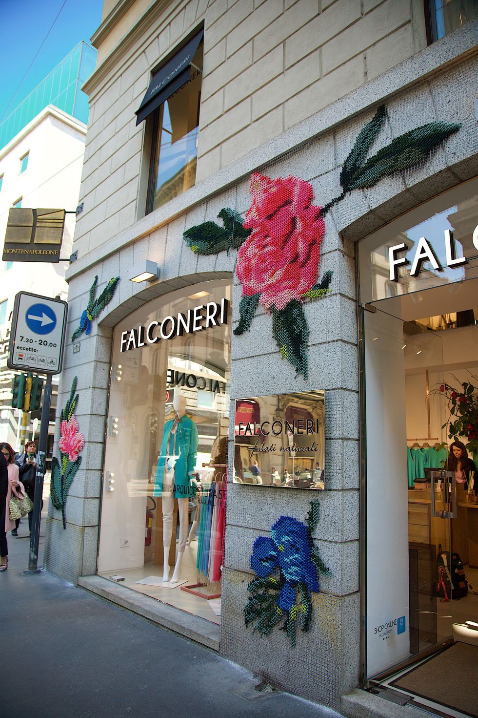 Falconeri è conosciuto in tutto il mondo per i suoi filati naturali. Specializzato nel cashmere, questo marchio italiano si è negli anni trasformato in un punto di riferimento per il mercato del lusso made in Italy. In occasione della Milano Design Week, lo store di Montenapoleone, angolo via Manzoni si è arricchito delle opere della designer valeriana Raquel Rodrigo. Il suo è un racconto dalla trama suggestiva, un vero e proprio intreccio di antiche tradizioni attualizzate. Così, grazie alla partnership con Falconeri, l'arte del ricamo si trasforma in un'opera monumentale. Un vero e proprio giardino incantato, con maxi fiori sui toni del rosa e del blu, incornicia le vetrine del negozio. «L'idea è quella di trasformare una forma d'arte intima in street art accessibile a tutti» spiegano. Le mura della città si fanno tessuto diventando tridimensionale e tattile.