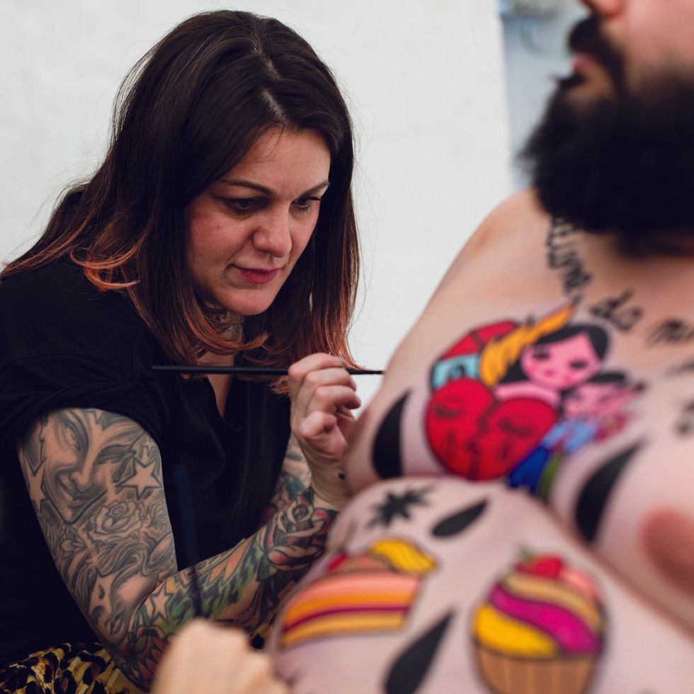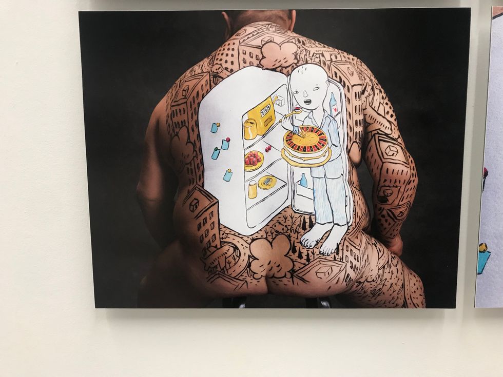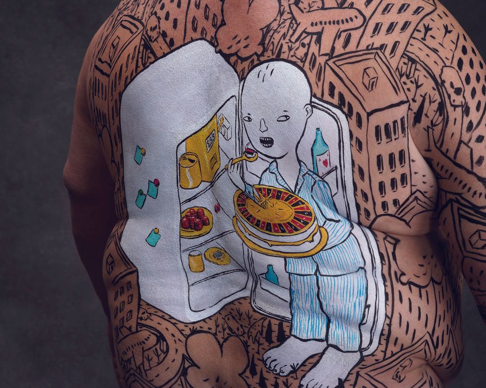 La mostra, intitolata Beyond the body ("Oltre il corpo", in inglese, ndr), è tanto piccola quanto efficace. Le storie, raccontate attraverso una serie di fotografie, sono quattro e così pure gli artisti che, coadiuvati dai fotografi Winkler+Noah, vi hanno partecipato. L'illustratrice Elisa Macellari, lo street artist Millo, la tatuatrice Amanda Toy e il calligrafo Nicolò Visioli hanno avuto modo, ciascuno, di disegnare sul corpo di una persona obesa la ragione di quel suo peso. Una ragione che travalica i confini dell'estetica per arrivare alla psicologia, ad un dolore profondo, radicato nell'animo di chi ha tentato di soffocarne la voce con il cibo. Beyond the body ha dato forma alle storie che, in televisione, sono raccontate ne La Clinica per Rinascere – Obesity Center Caserta, su Real Time (da ieri ogni lunedì alle 21.10 sul canale 31 del digitale terrestre). Le ha trasformate in vignette e dipinte su persone reali: sulle pance strabordanti, sulle braccia adipose, su seni troppo grandi per essere invidiabili. Lì, sui corpi dei protagonisti, si sono consumate le loro vicende. E una, su tutte, è utile a spiegare come l'obesità non sia la risultante di un amore troppo grande, quello per il cibo.