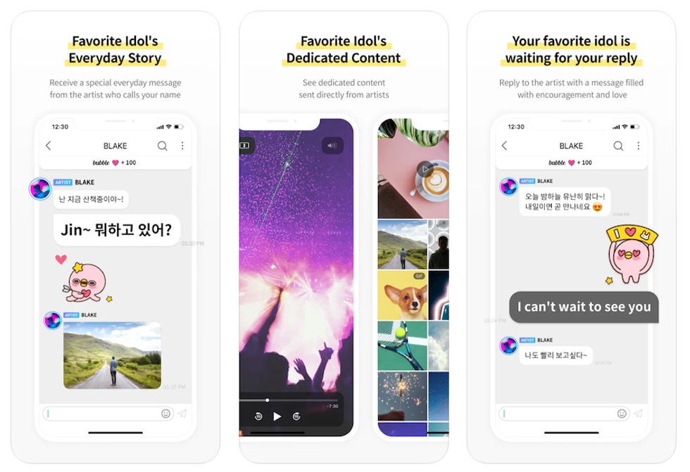 Un tempo c'erano i fan meeting. Oggi ci sono le app, simili a Whatsapp, in cui si può chattare con il proprio idol preferito. È il caso di Bubble, una piattaforma creata dalla JYPE, una delle agenzie di intrattenimento coreane più famose che consente, attraverso la sottoscrizione di un abbonamento, di poter entrare in contatto in chat con gli idol dell'etichetta.