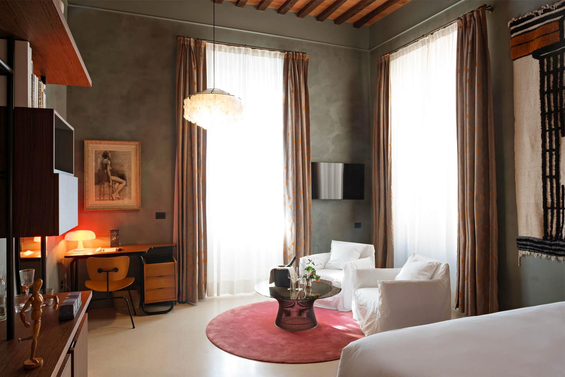 La sinergia tra natura e opere contemporanee prosegue in ogni stanza dell’albergo (suite, rooftop suite, junior suite e deluxe le migliori) arredate con mobili artigianali unici, preziosi marmi, lampade di design e una opera d'arte originale, realizzata nel periodo di tempo che va dall'apertura ai giorni nostri, pronti a dialogare con l'ospite in maniera intima, rendendo la camera un luogo personale ed inconfondibile.