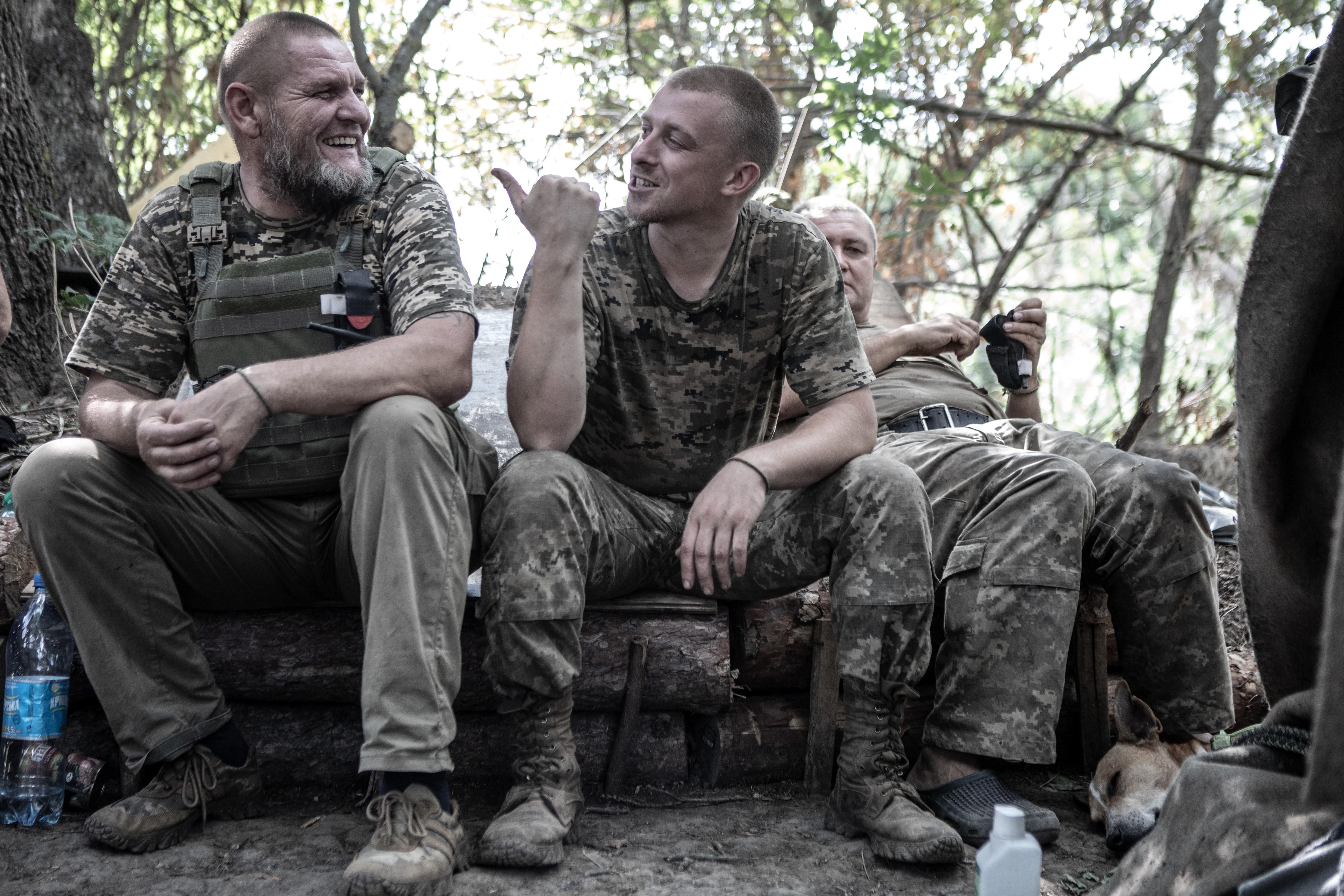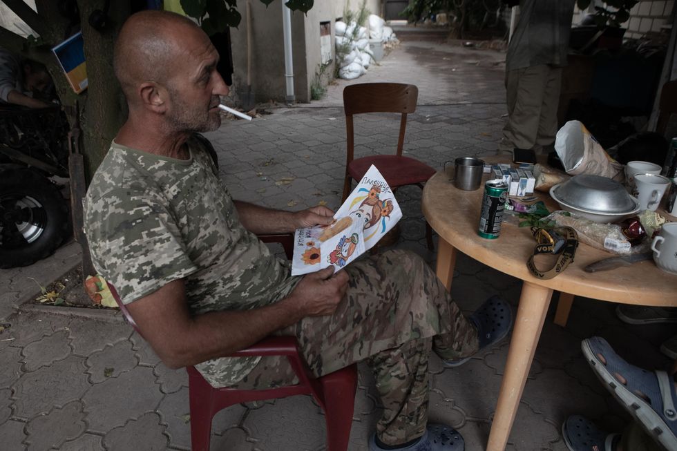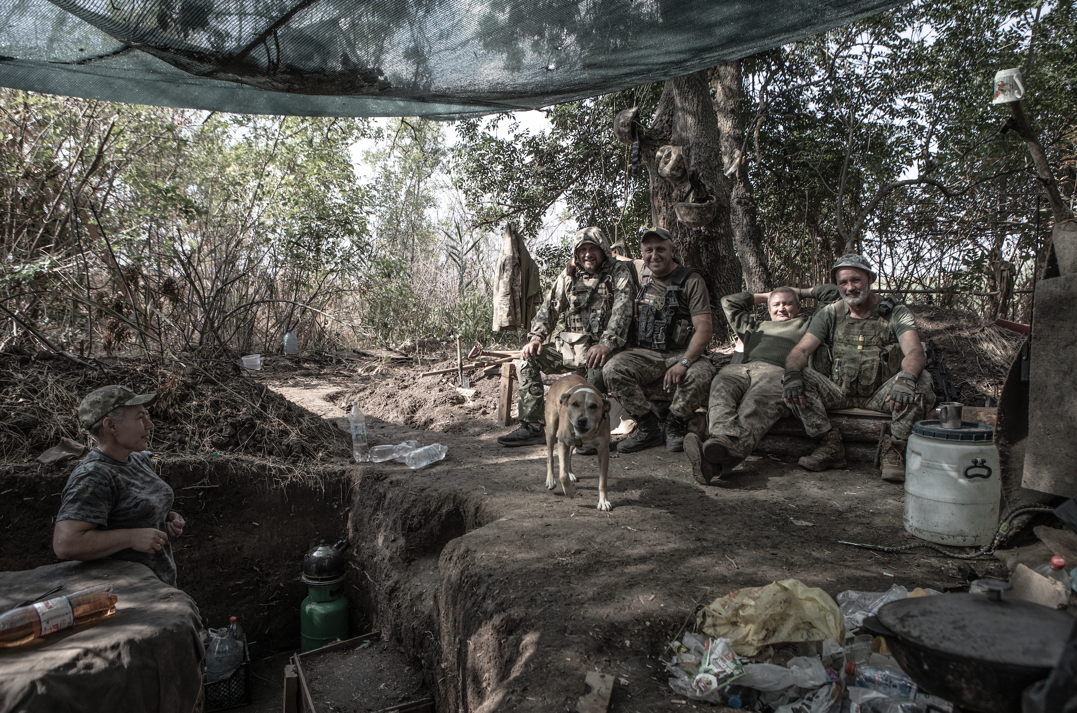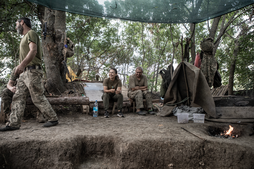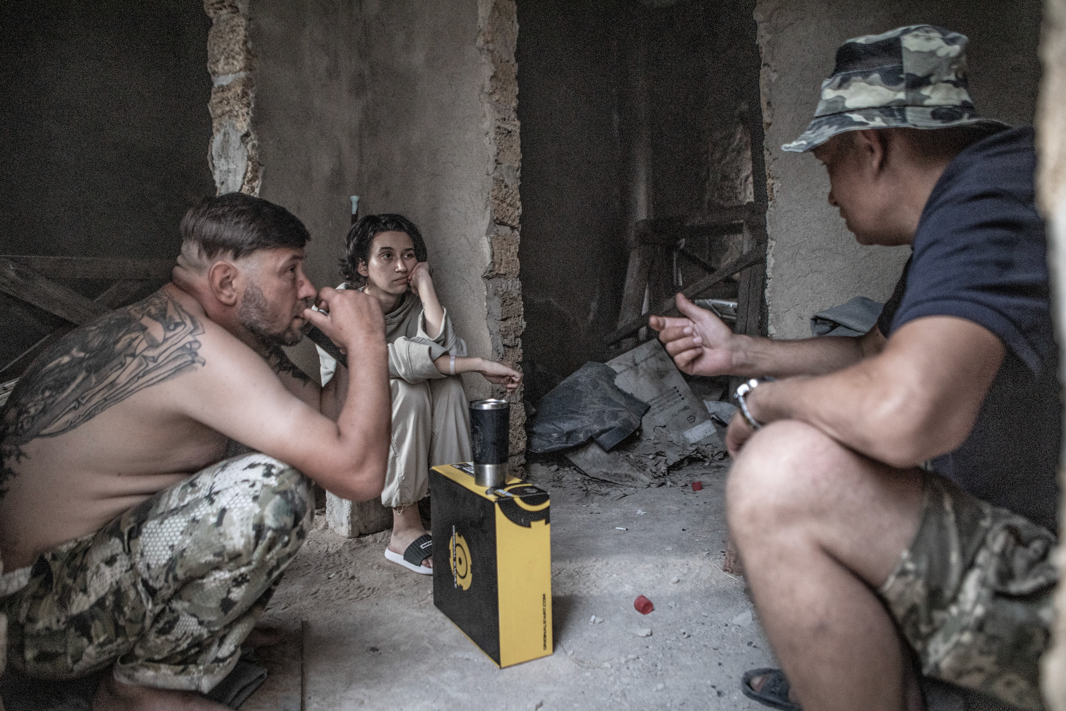Victoria, questo è il suo nome, è sul fronte dal 15 marzo, prima a Kiev e poi qui al Sud dove stabilizza e cura le ferite dei soldati che arrivano dalle vicine trincee e vengono poi evacuati verso l’ospedale più vicino. Quando arriviamo in questa postazione sul fronte vicino ai territori occupati dai russi sta preparando del caffè per alcuni soldati che si riposano all’ombra di un albero. Questo oltre che essere un «punto giallo», come loro chiamano in gergo le aree di pronto soccorso, è anche un posto dove si passa per salutare, riposare, fare due chiacchiere.