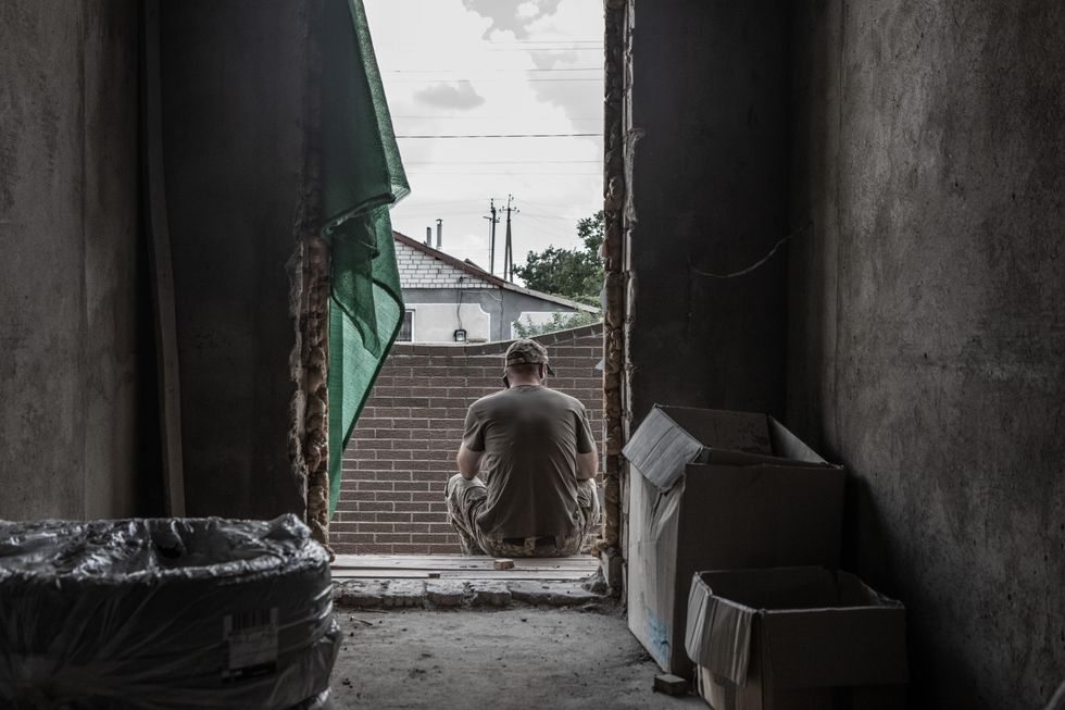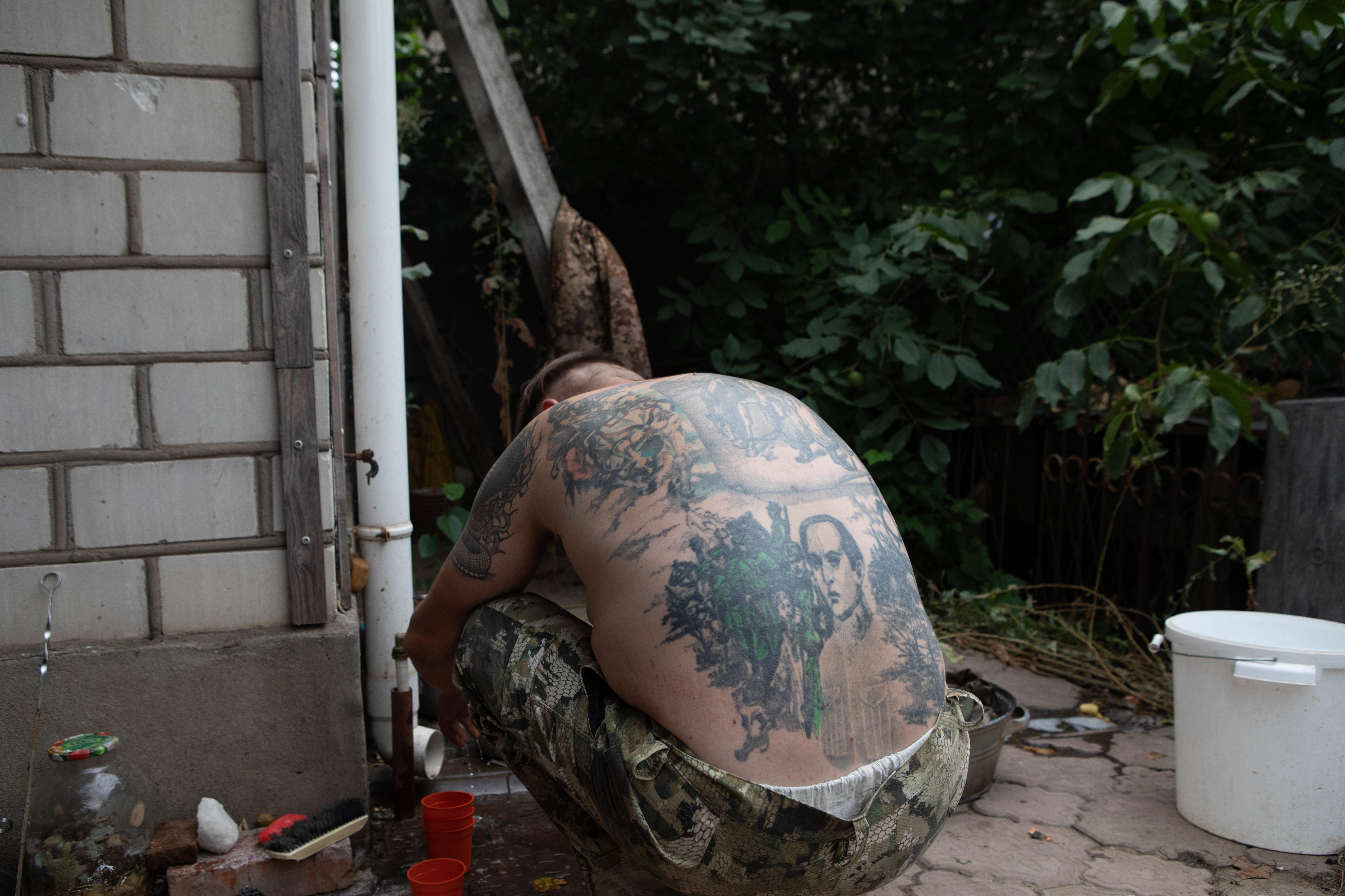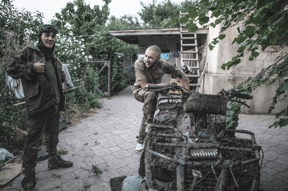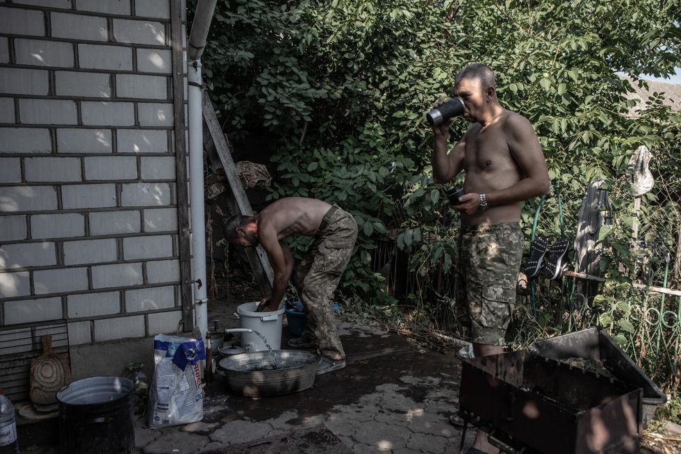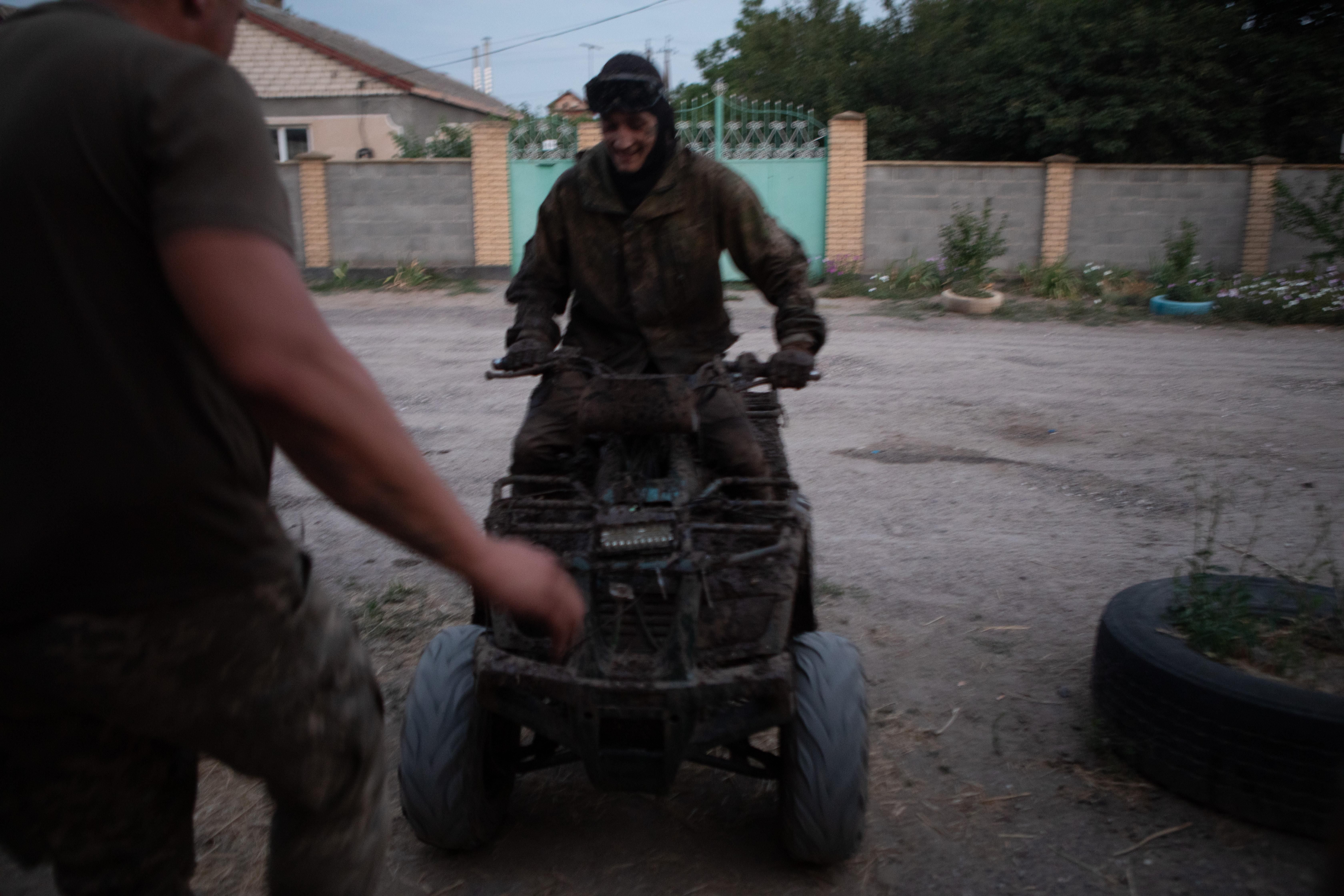 Victoria, questo è il suo nome, è sul fronte dal 15 marzo, prima a Kiev e poi qui al Sud dove stabilizza e cura le ferite dei soldati che arrivano dalle vicine trincee e vengono poi evacuati verso l’ospedale più vicino. Quando arriviamo in questa postazione sul fronte vicino ai territori occupati dai russi sta preparando del caffè per alcuni soldati che si riposano all’ombra di un albero. Questo oltre che essere un «punto giallo», come loro chiamano in gergo le aree di pronto soccorso, è anche un posto dove si passa per salutare, riposare, fare due chiacchiere.