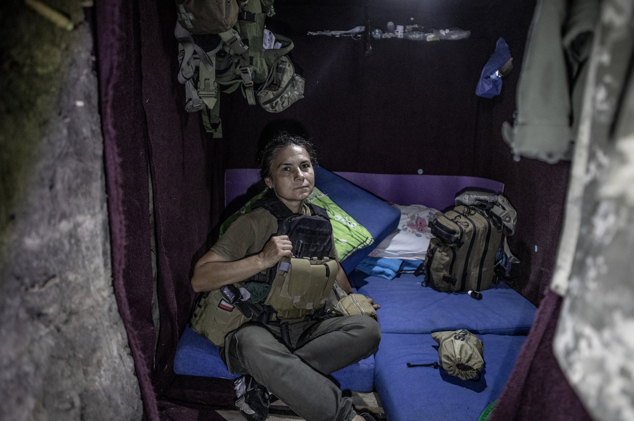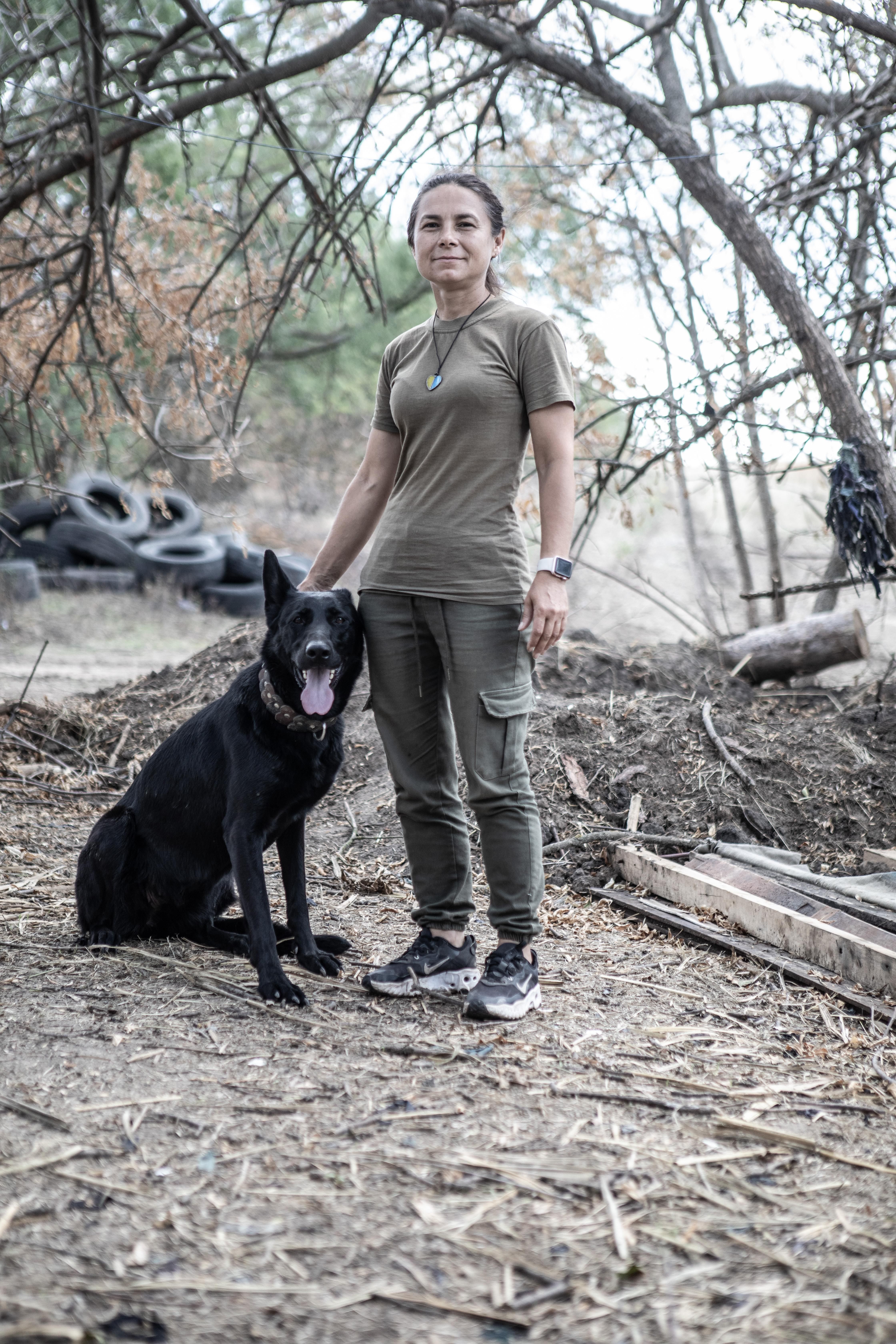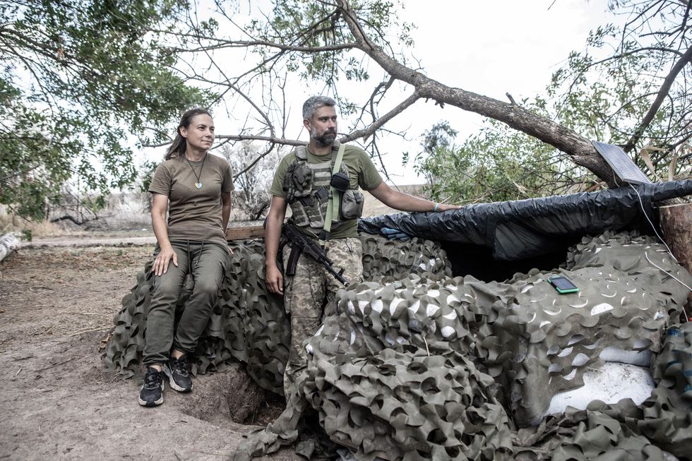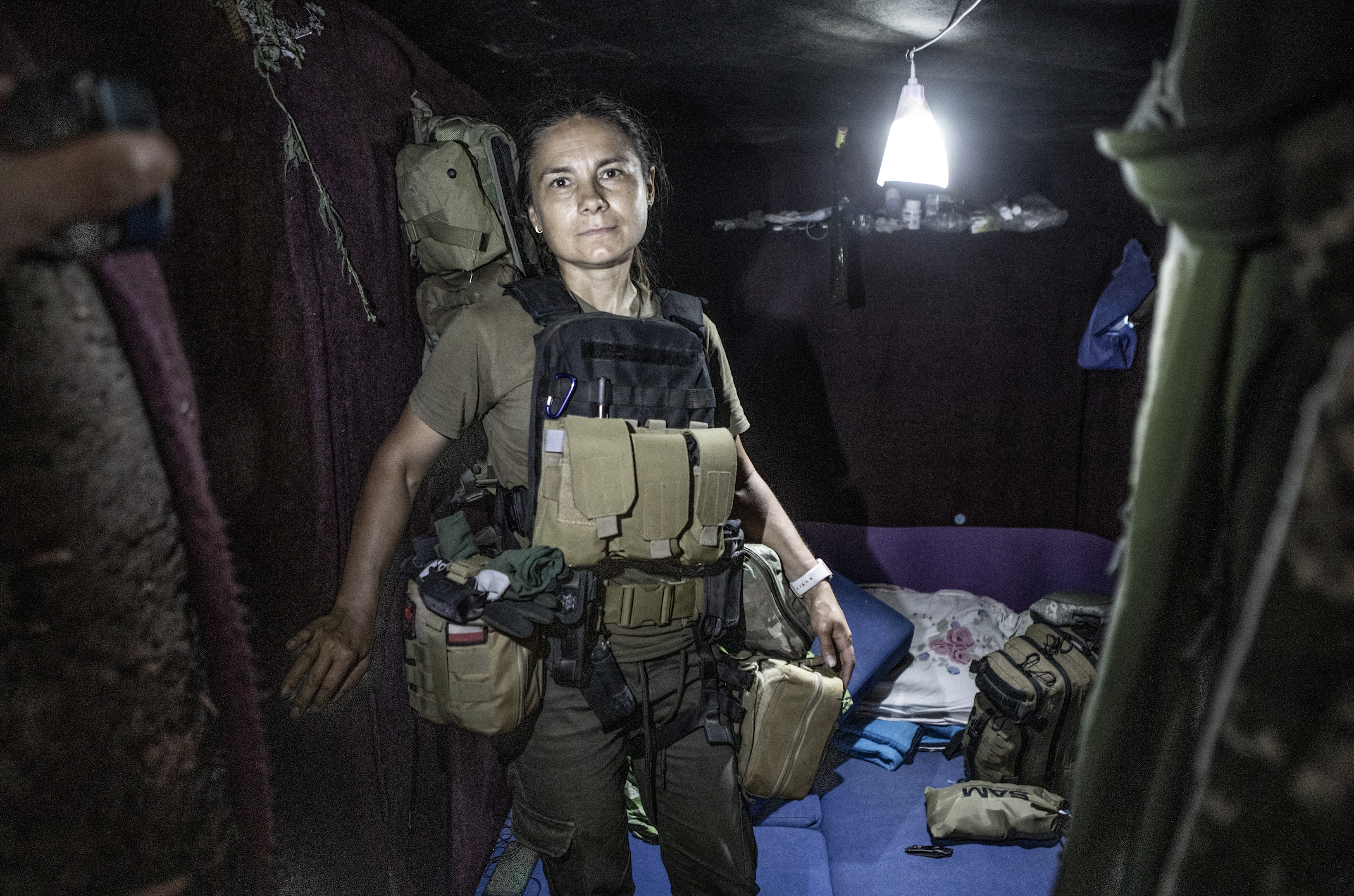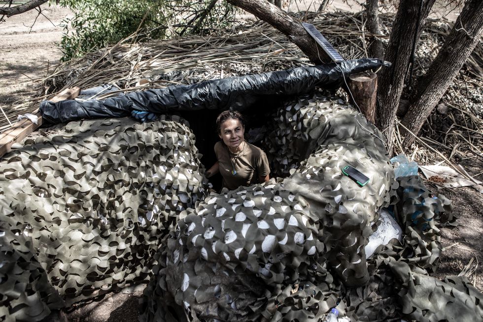 Il suo soprannome è «uccellino», ptashka in ucraino, la incontriamo nella trincea di primo soccorso accanto al fronte di Kherson. È piccolina, con i capelli legati e un completo pantaloni e t-shirt verdi militare bene aderenti che le mettono in risalto le forme. Fuori dalla maglietta porta una collanina con un cuore diviso in due dai colori della bandiera ucraina, sorride ed i suoi occhi si fanno sempre più piccolini e luccicanti mentre le scattiamo delle fotografie.