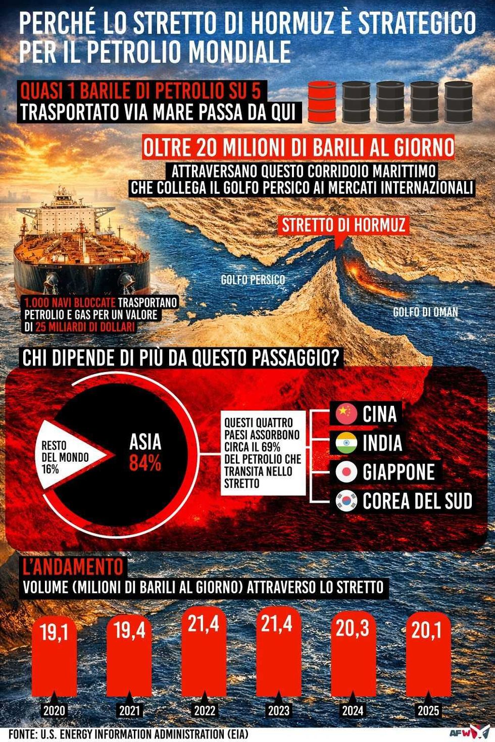 Attraverso Hormuz transitano circa 20 milioni di barili di petrolio al giorno, quasi un quinto del mercato globale. Ogni blocco o interruzione fa salire i prezzi e colpisce le principali economie, rendendo il passaggio una vera leva strategica per l’energia mondiale.