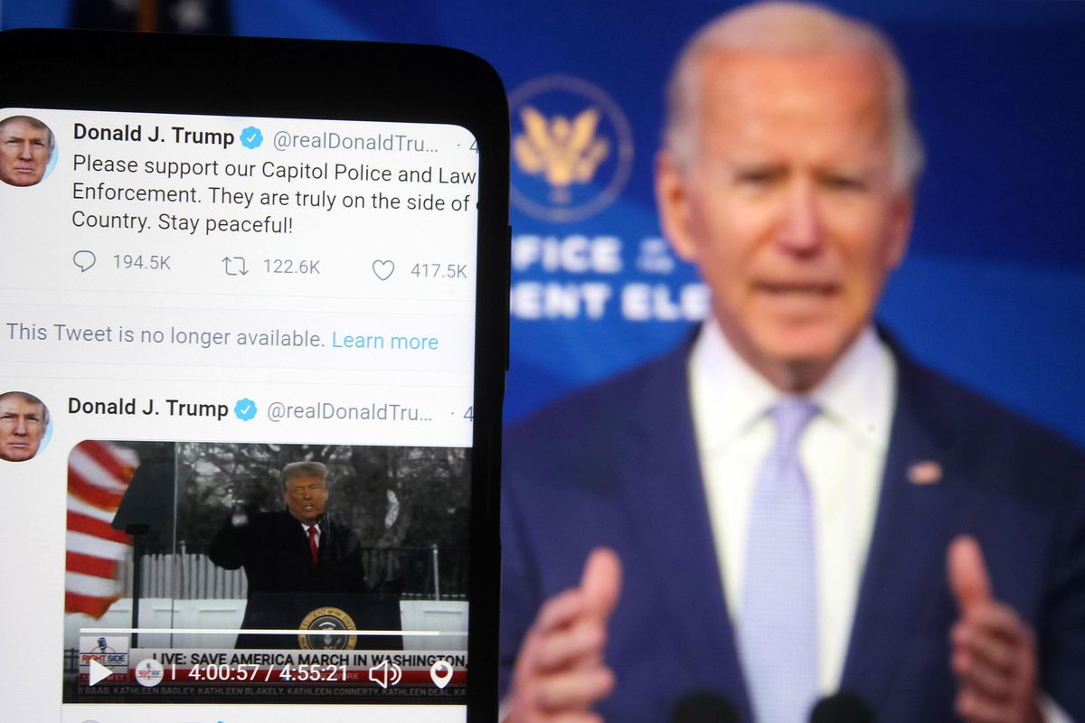 Mercoledì sera poco prima delle 23 (ora italiana) sotto il videomessaggio pubblicato sul suo profilo Twitter dal presidente Donald Trump per invitare i suoi sostenitori - definiti «patrioti» - ad andare a casa è comparso un avviso del social network: «L'affermazione che le elezioni sono state truccate viene contestata e pertanto questo tweet non può ricevere commenti o like e non può essere ritwittato a causa di un rischio di violenze». Poco prima Twitter ne aveva segnalato un altro in cui Trump ripeteva che il voto per la Casa Bianca era stato un furto di democrazia.