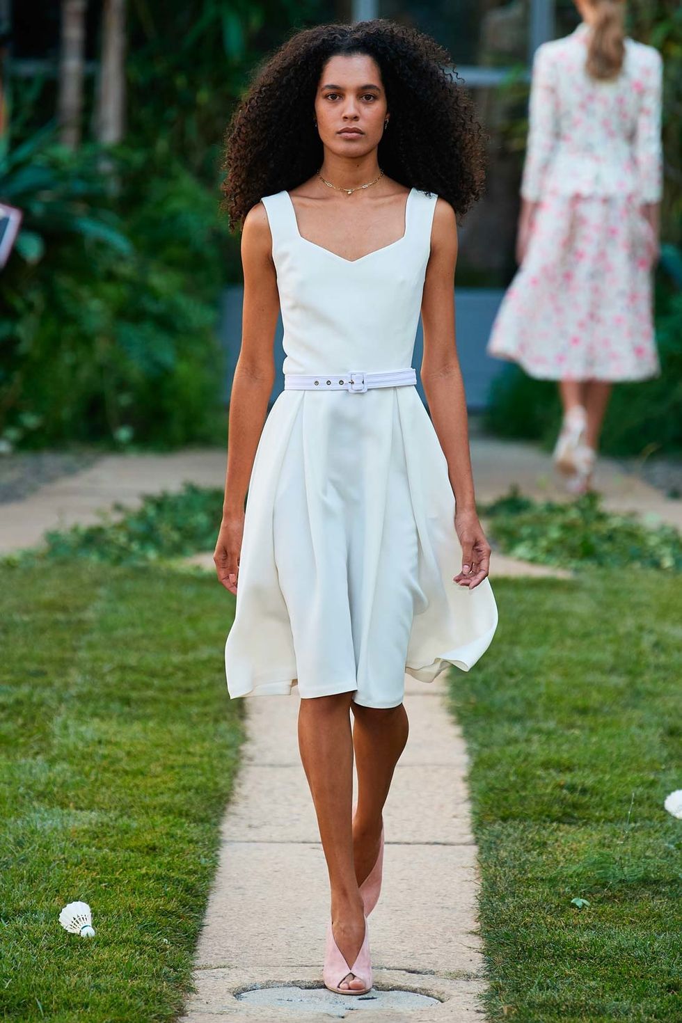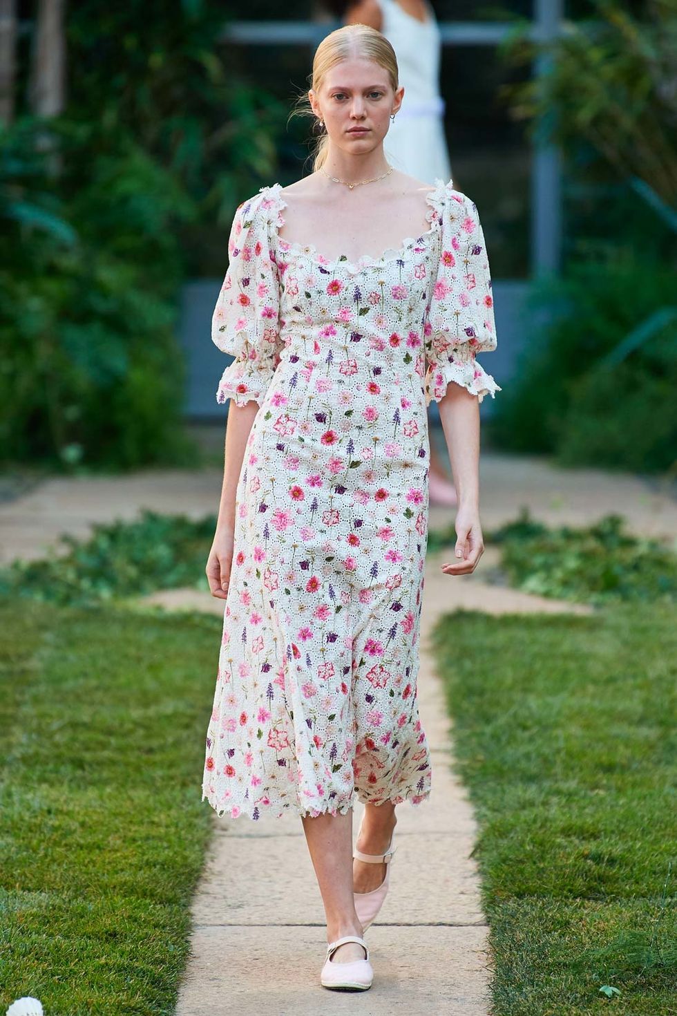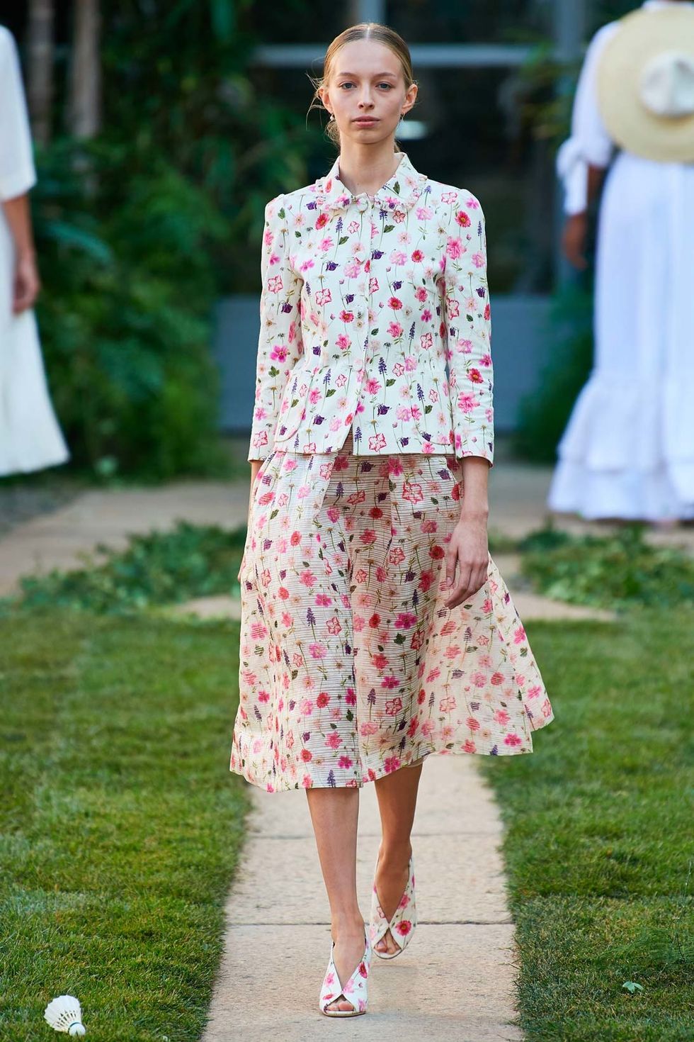Si rincorrono sul prato morbidi pantaloni indossati sotto maglie o bluse con maniche a tre quarti e tasche applicate, leggeri grembiuli sangallo a gonna asimmetrica. I fiori del giardino diventano stampa-erbario su abiti che lasciano la schiena scoperta oppure motivo intricato per lunghi e impalpabili chemisier di pizzo, o ancora preziosi dettagli su abiti d'organza con maniche dai grandi volumi. Come in un family match, essenziali look total white appena svasati si intervallano a pentagrammi di fil coupé bianchi sui quali si scrivono piccoli nastri azzurri. Tra i tessuti cotone, lino, organza, fil coupé, pizzo, sangallo in mille sfumature di bianco, panna, crema, écru, rosa, gradazioni di carta da zucchero, azzurro, denim, fiordaliso e blu.