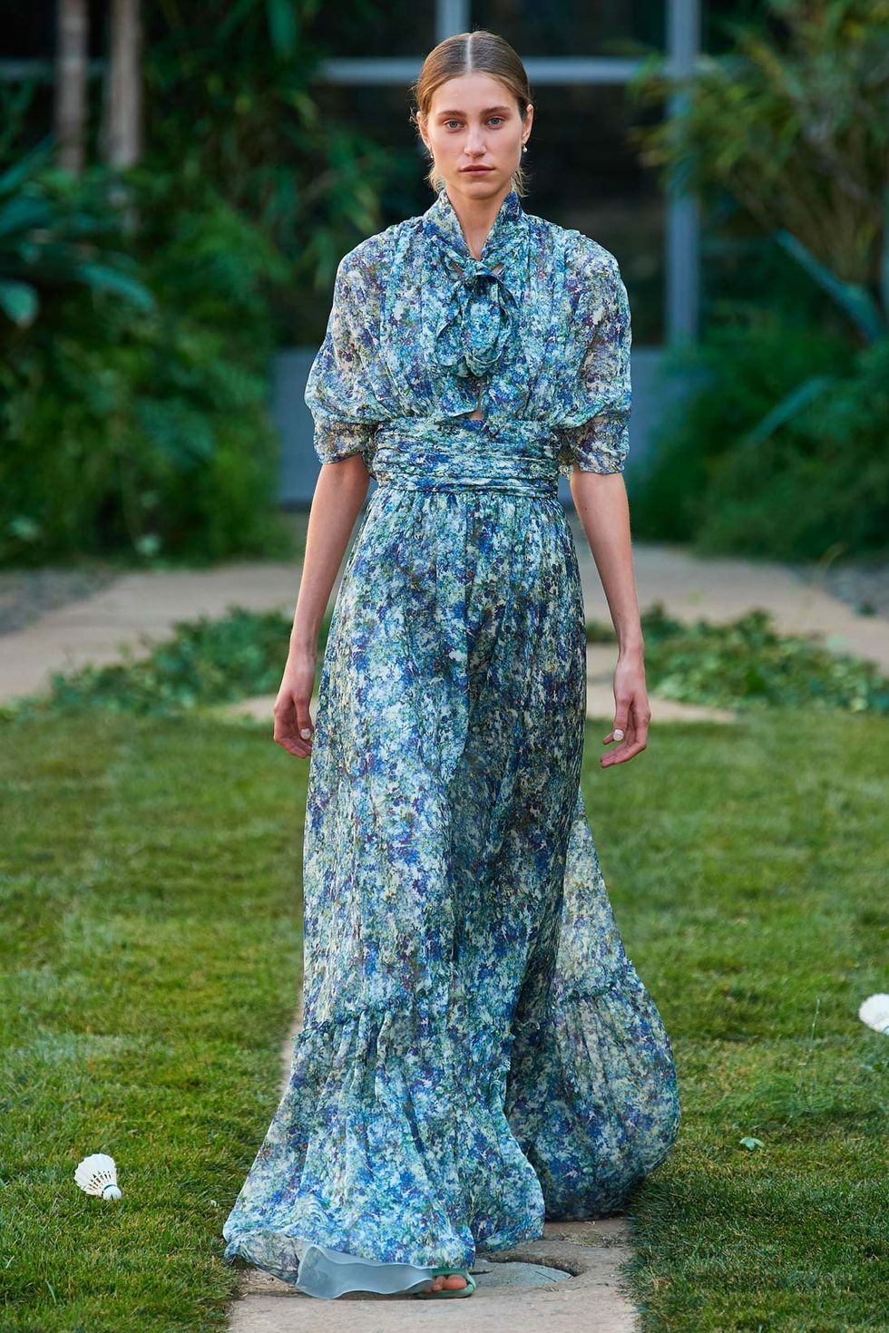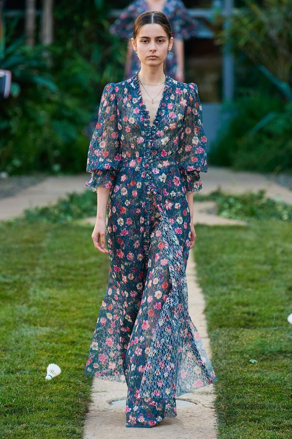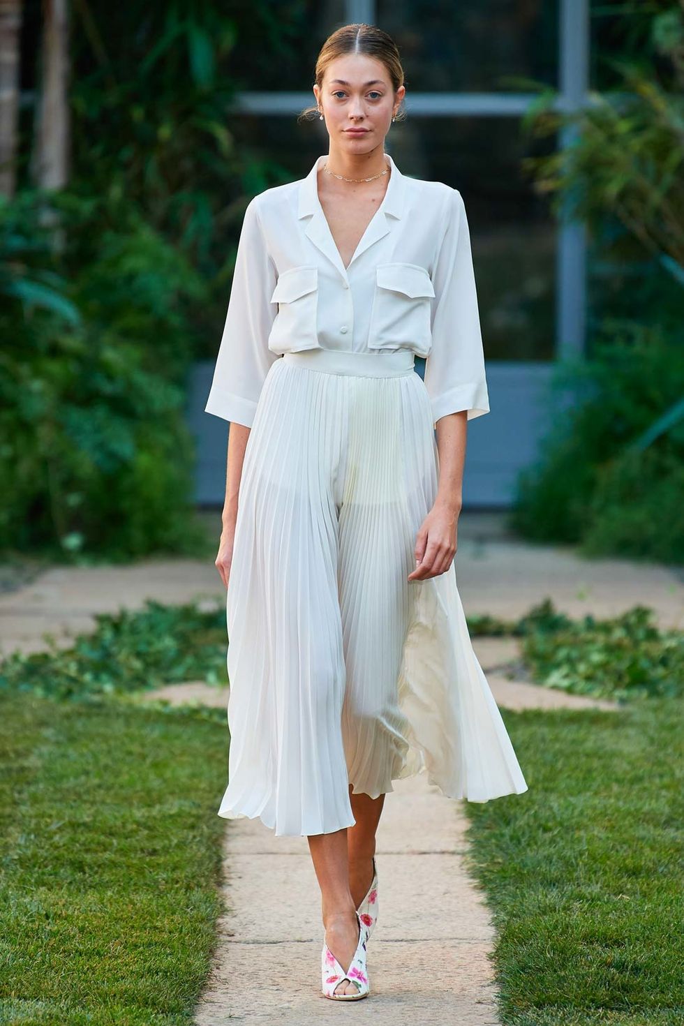 Si rincorrono sul prato morbidi pantaloni indossati sotto maglie o bluse con maniche a tre quarti e tasche applicate, leggeri grembiuli sangallo a gonna asimmetrica. I fiori del giardino diventano stampa-erbario su abiti che lasciano la schiena scoperta oppure motivo intricato per lunghi e impalpabili chemisier di pizzo, o ancora preziosi dettagli su abiti d'organza con maniche dai grandi volumi. Come in un family match, essenziali look total white appena svasati si intervallano a pentagrammi di fil coupé bianchi sui quali si scrivono piccoli nastri azzurri. Tra i tessuti cotone, lino, organza, fil coupé, pizzo, sangallo in mille sfumature di bianco, panna, crema, écru, rosa, gradazioni di carta da zucchero, azzurro, denim, fiordaliso e blu.