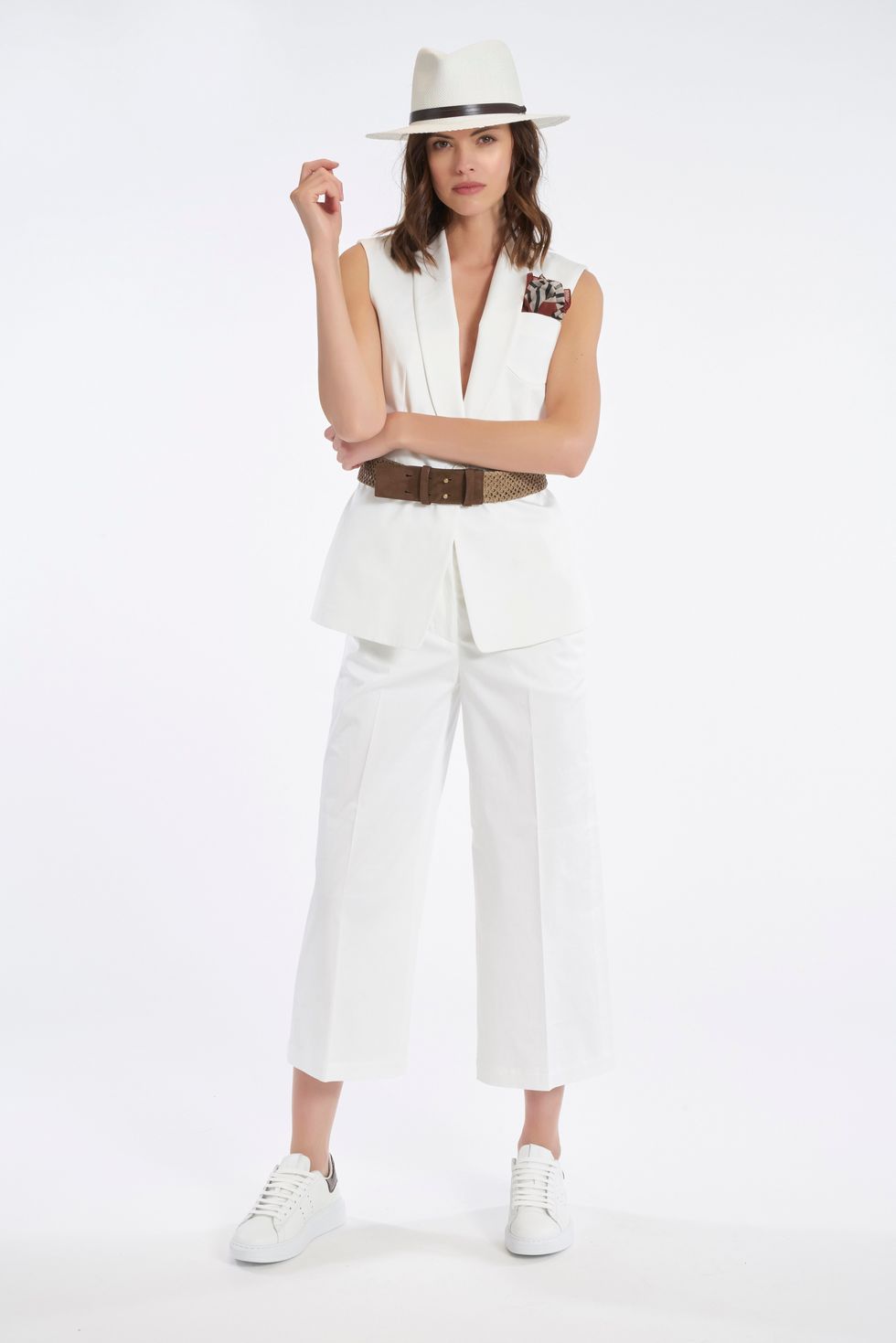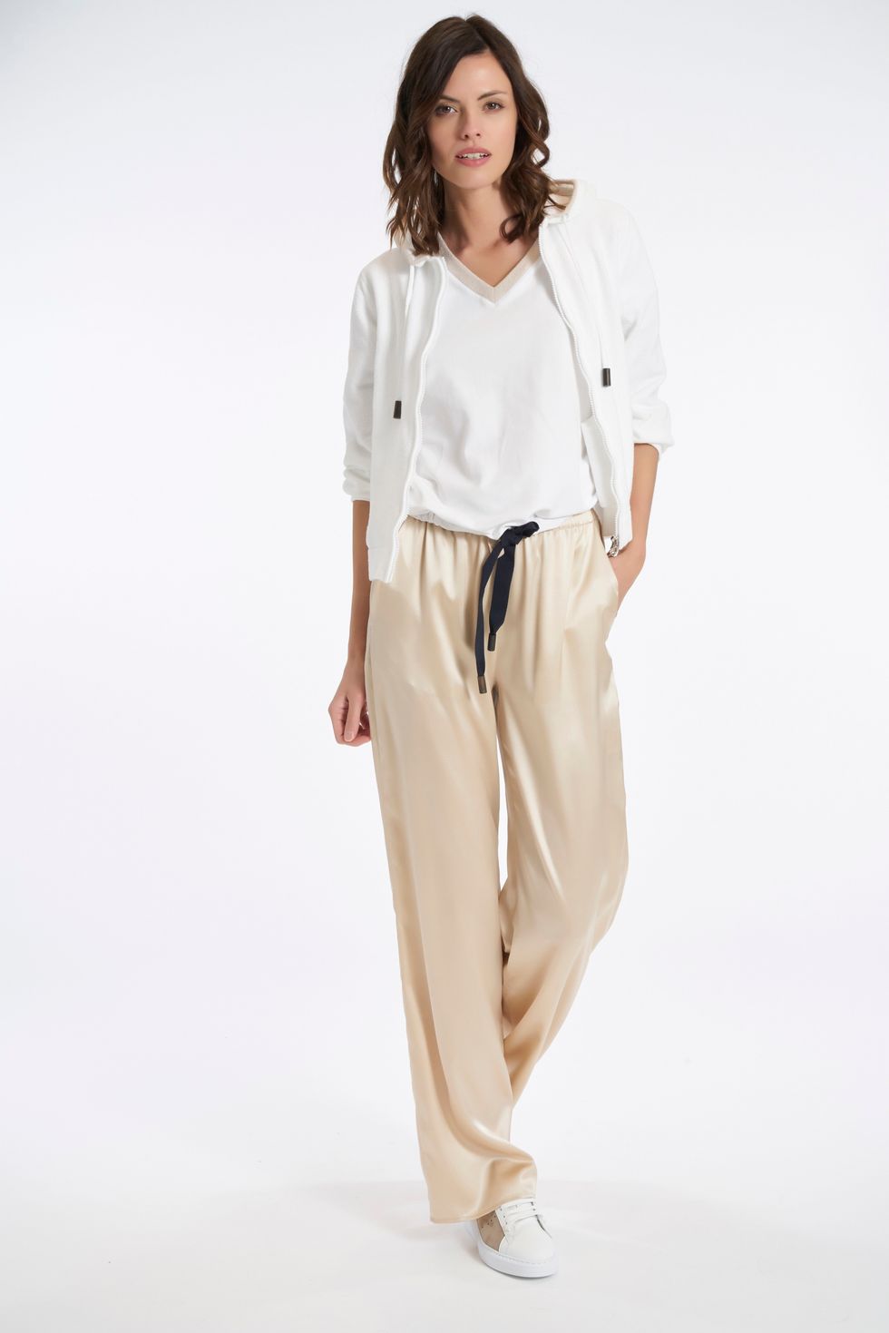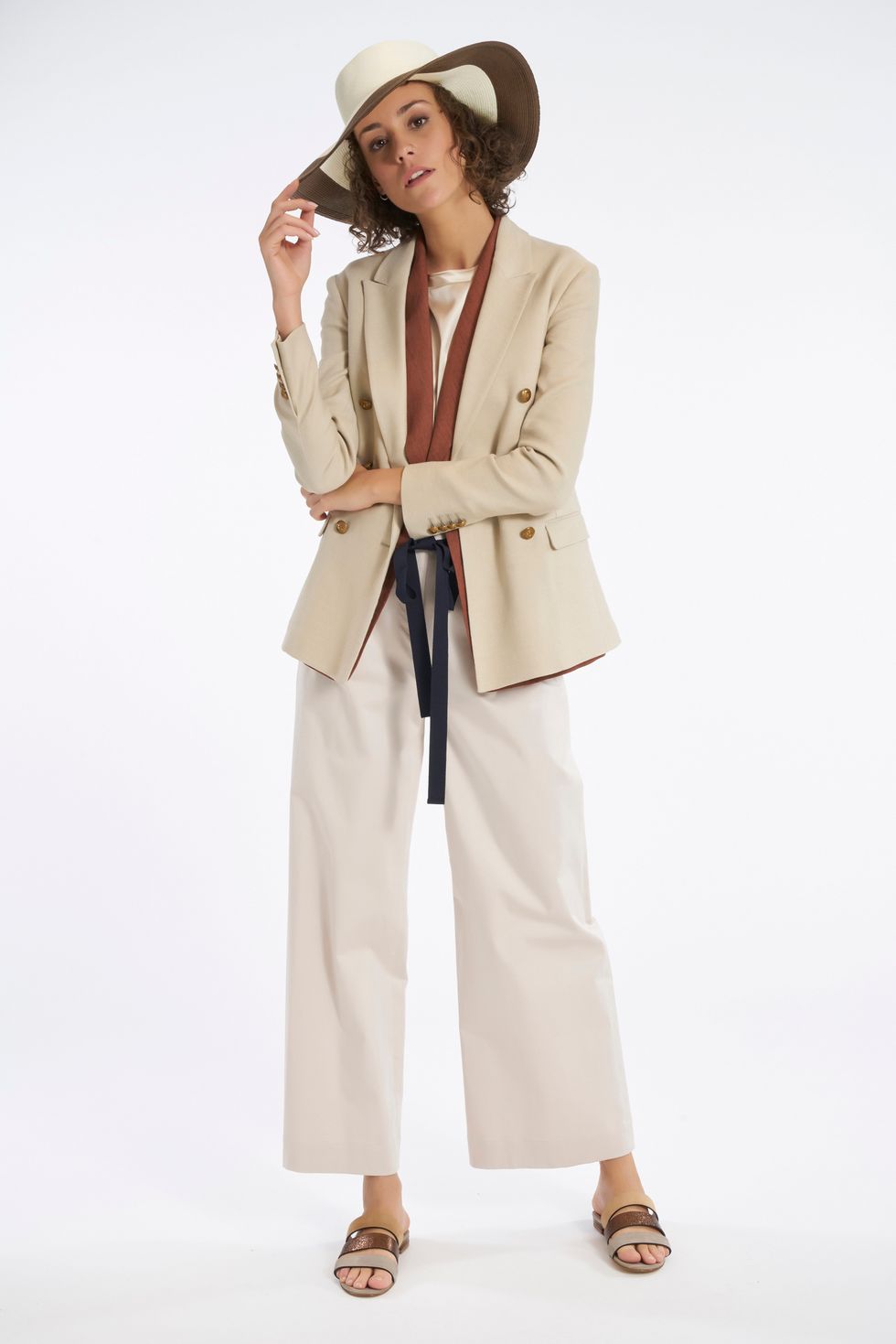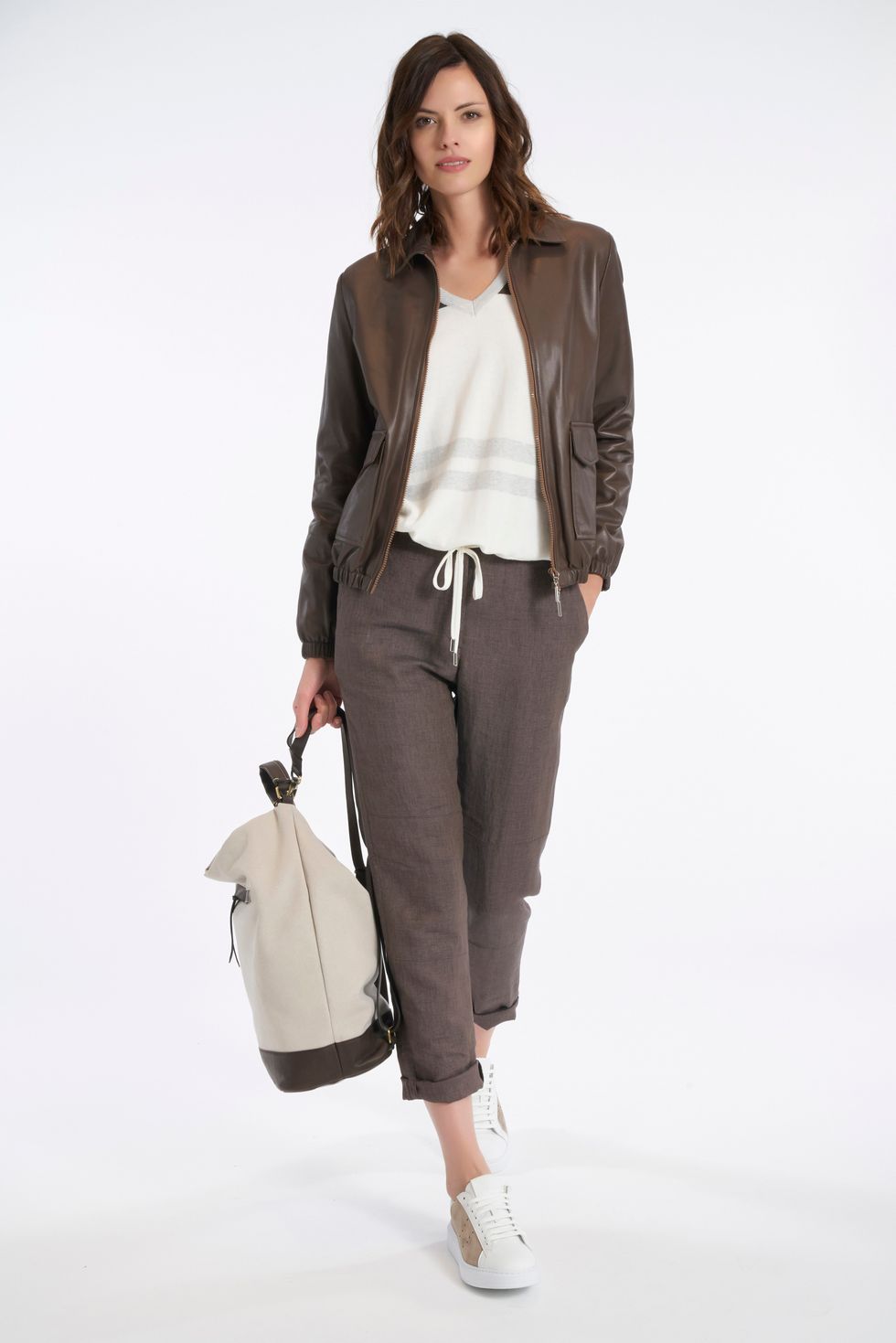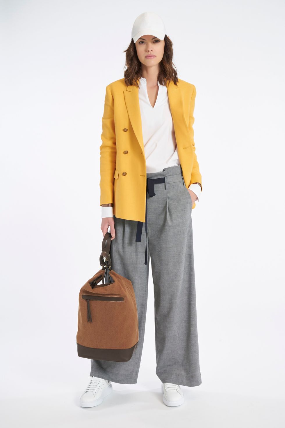 Look sofisticati e ricchi di un calore dato dalle tinte nei toni del bruciato, hanno la caratteristica di una profonda attenzione ai concetti di ecosostenibilità e di cura verso la natura, «un tema oggi troppo importante per essere disatteso». Leggerezza è una delle parole chiave di questa collezione capace di unire sete e satin impalpabili per gli abiti a tessuti più sostenuti usati per le impeccabili giacche di Eleventy che rimangono il must have del brand: monopetto e doppiopetto, con bottoni in metallo spazzolato oro che fanno risaltare i colori della terra, dei bruciati, dei bianchi e dei panna. Giacche multitasche dalle linee femminili garantiscono un tocco grintoso e raffinato.