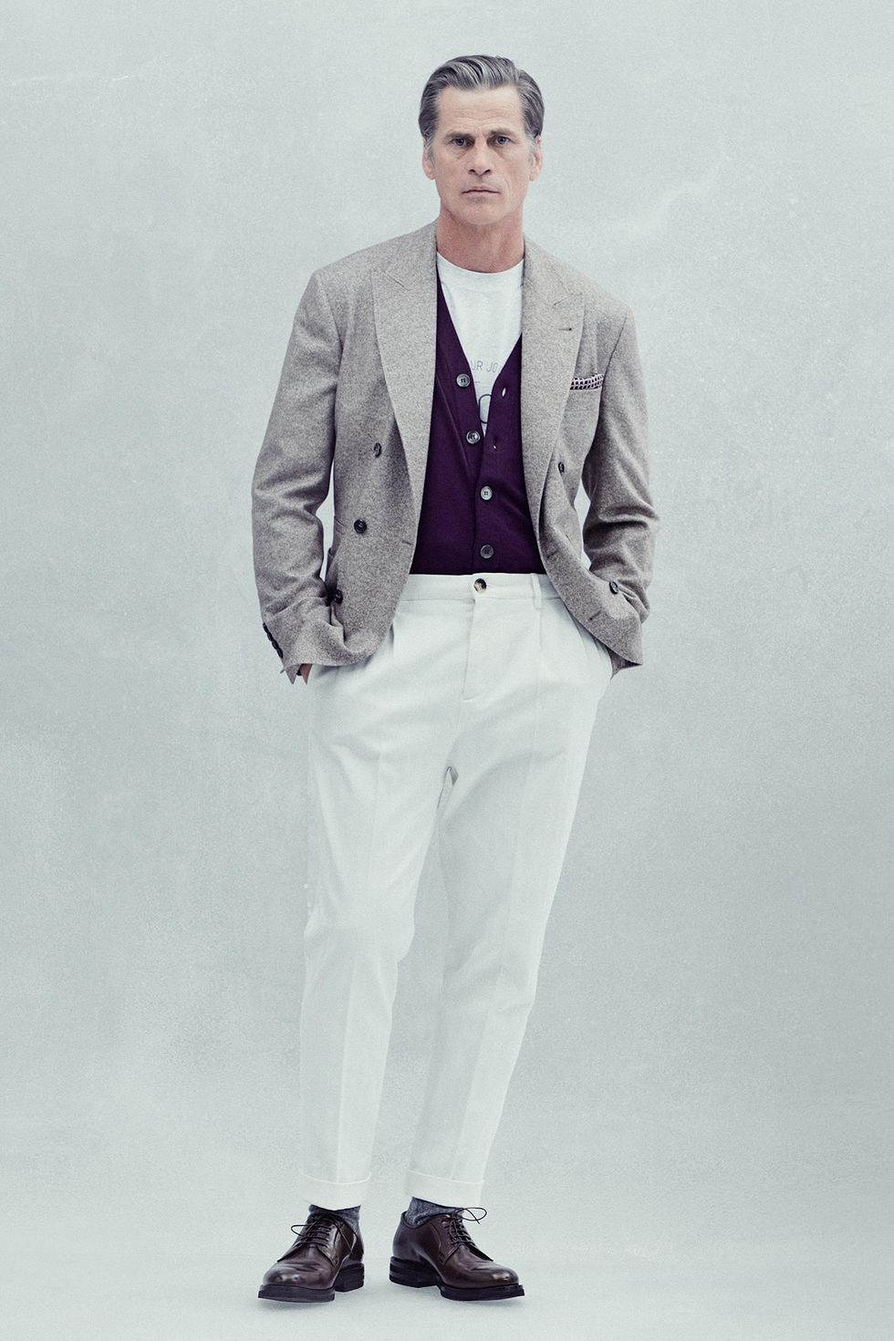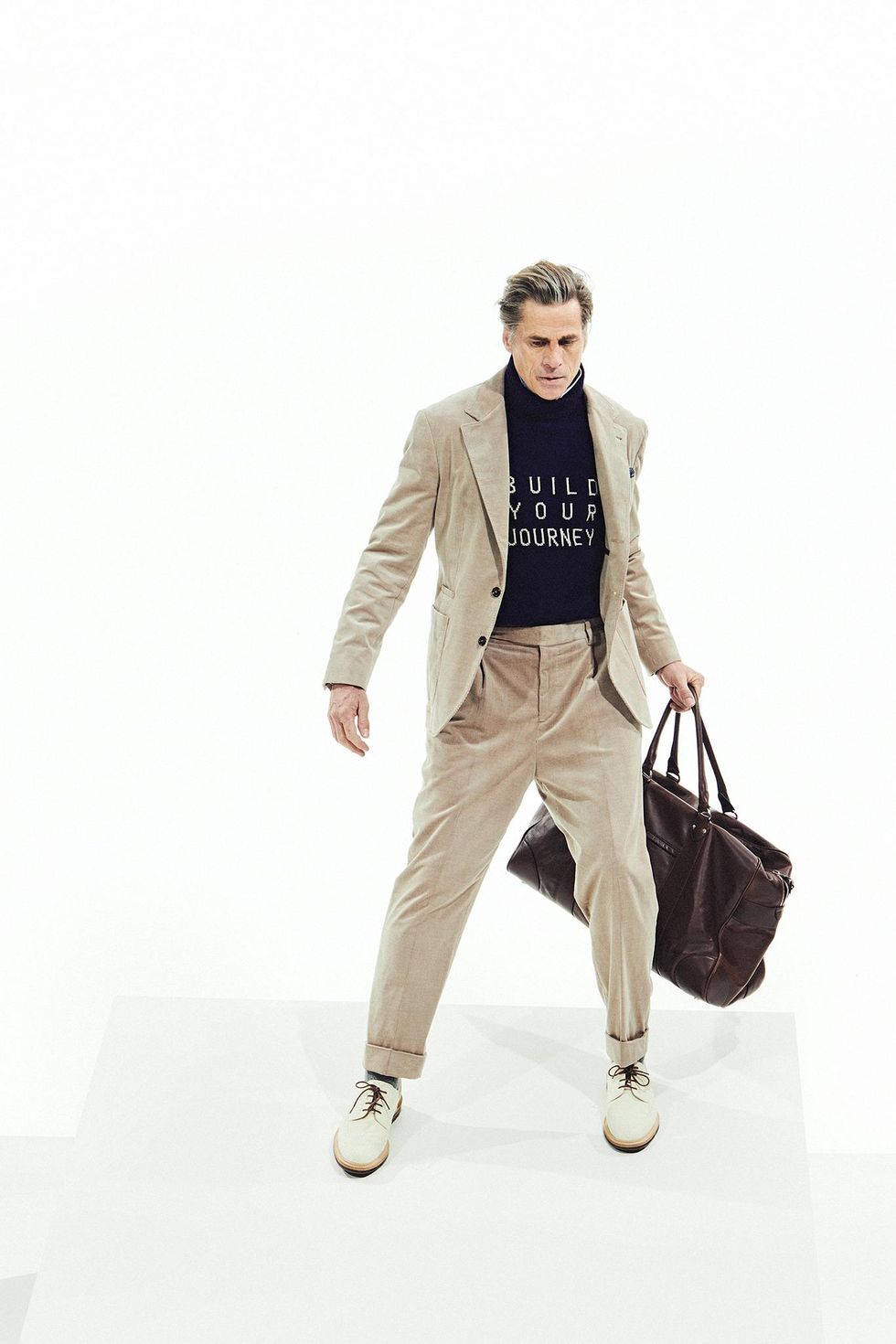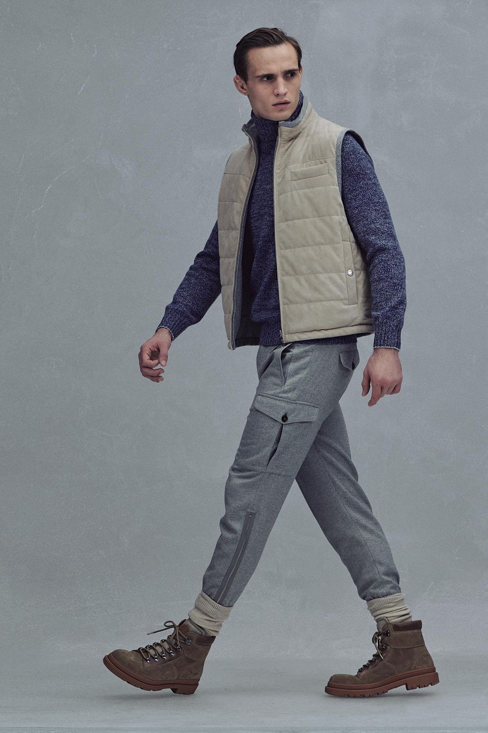Fibre nobili e tessuti moderni sono al servizio del comfort, della morbidezza e soprattutto della leggerezza. Abiti e giacche sono in materiali preziosi dal gusto moderno e perfino i piumini sono spesso in cashmere. Lo spirito di Brunello Cucinelli è sempre al positivo. «Sono anche convinto che quando finirà la pandemia andrò al ristorante sette giorni su sette.Vorremo tutti vestirci bene e accarezzare di nuovo i tessuti. Quando si entrerà nei nostri store, gli addetti dovranno essere amichevoli, gentili e avere buone maniere. Basta con la superficialità, con le trovate a effetto, con l'esibizione fine a se stessa: se c'è una lezione che il 2020 ci ha insegnato è che non abbiamo né il tempo, né la voglia e né i mezzi per dare retta a ciò che è inutile. Mi pare un bel punto da cui ripartire».