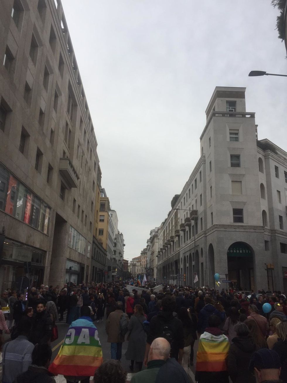 Così tra un «su le mani» e un «voglio vedervi ballare», il corteo si è spostato in poco più di due ore da Palestro, passando per San Babila, continuando in corso Matteotti per concludere il tragitto in piazza Duomo. L'idea era quella di creare un evento contro qualunque forma di discriminazione ma, facendosi largo all'interno del corteo, indubbiamente gremito (anche se la soglia delle 200.000 persone presenti pareva un tantino ottimistica), saltava subito all'occhio che le persone di colore o di altre nazionalità erano percentualmente pochissime e perlopiù inconsapevoli. L'unica a farsi notare era la comunità cinese con tanto di dragone colorato e persone che non parlavano una parola di italiano.