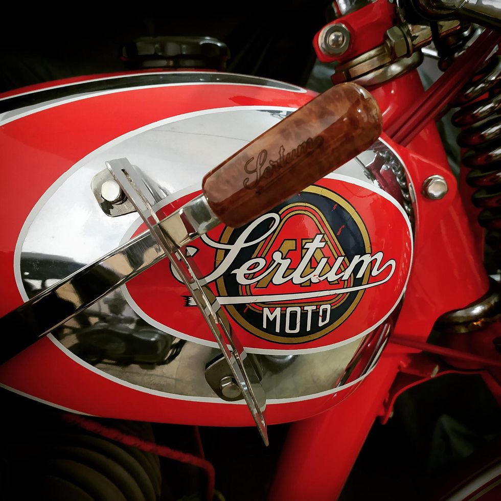 La storia della Sertum (in latino, ghirlanda) comincia in un’officina di viale Certosa a Milano nel lontano 1922, quando al numero 226 nacquero le Officine Meccaniche Fausto Alberti, inizialmente dedicate alla costruzione di componenti e motori per usi industriali e motonautica. Soltanto dieci anni dopo il marchio lombardo tentò l’avventura nel nascente mercato delle motociclette, ancora retaggio di una élite ben lontana dai numeri della motorizzazione di massa degli anni Cinquanta dominata dalla diffusione delle due ruote. Nonostante la sostanziale ristrettezza della domanda, Sertum fu in grado di anticipare i tempi, proponendo due cilindrate basse, caratterizzate dall’ottima qualità costruttiva e dall’economicità di esercizio, pensando alla sempre più popolare diffusione delle moto. Sono queste le caratteristiche dei primi due modelli usciti da viale Certosa, la 175 VL (valvole laterali) e la piccola Batua, con propulsore da soli 120cc. Entrambe caratterizzate dalla struttura a telaio rigido, la 175, dalla linea classica e filante era dotata di cambio a tre velocità con comando al serbatoio. Avveniristica sotto diversi aspetti era la piccola Batua, con il telaio aperto in lamiera stampata, due sole marce e un prezzo competitivo di 3.500 lire. Negli anni immediatamente successivi all’inizio della produzione motociclistica, la gamma Sertum si ampliò notevolmente, con i motori di cilindrata superiore. L’offerta del marchio milanese spaziava alla metà degli anni Trenta dalle 175 proposte in diversi allestimenti turistici o sportivi alle 250cc anch’esse a valvole laterali e presentate in seguito anche ammortizzate grazie al telaio elastico. In listino comparve anche l’ammiraglia, una bicilindrica da 500cc. che si affiancava alle coeve Guzzi e Gilera nel segmento delle mezzo litro. Gli anni Trenta segnarono anche l’inizio dell’avventura di Sertum nel mondo delle competizioni, in particolare nelle gare di regolarità che alla fine del decennio segnò per il marchio milanese una stagione di successi con ben sei ori alla Sei Giorni del 1939. Lo scoppio della guerra, come accadde a tutte le case motociclistiche italiane, significò la conversione della produzione esclusivamente a moto militari. Anche la Sertum fece la sua parte, presentando la MCM 500 dotata del già collaudato bicilindrico a valvole laterali. Dalla produzione civile a quella militare passò anche il motocarro, dotato del propulsore da mezzo litro a cui fu applicata una soluzione per il raffreddamento forzato tramite ventola dall’apertura regolabile.