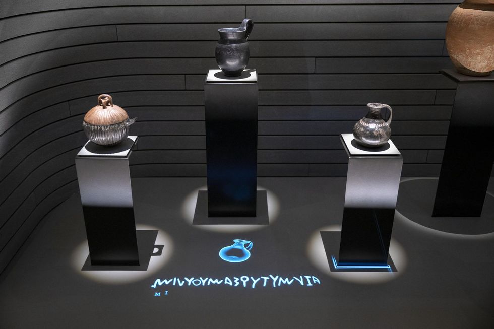 Il percorso espositivo inizia con una grande urna cineraria in travertino, ospitata da un’architettura in pietra, e si muove all’interno delle cupole tra teche triangolari in cristallo che espongono i grandi vasi, gli ex voto, le antefisse e i piccoli bronzi etruschi, posti avvento a opere contemporanee di William Kentridge, Lucio Fondata e Arturo Martini.