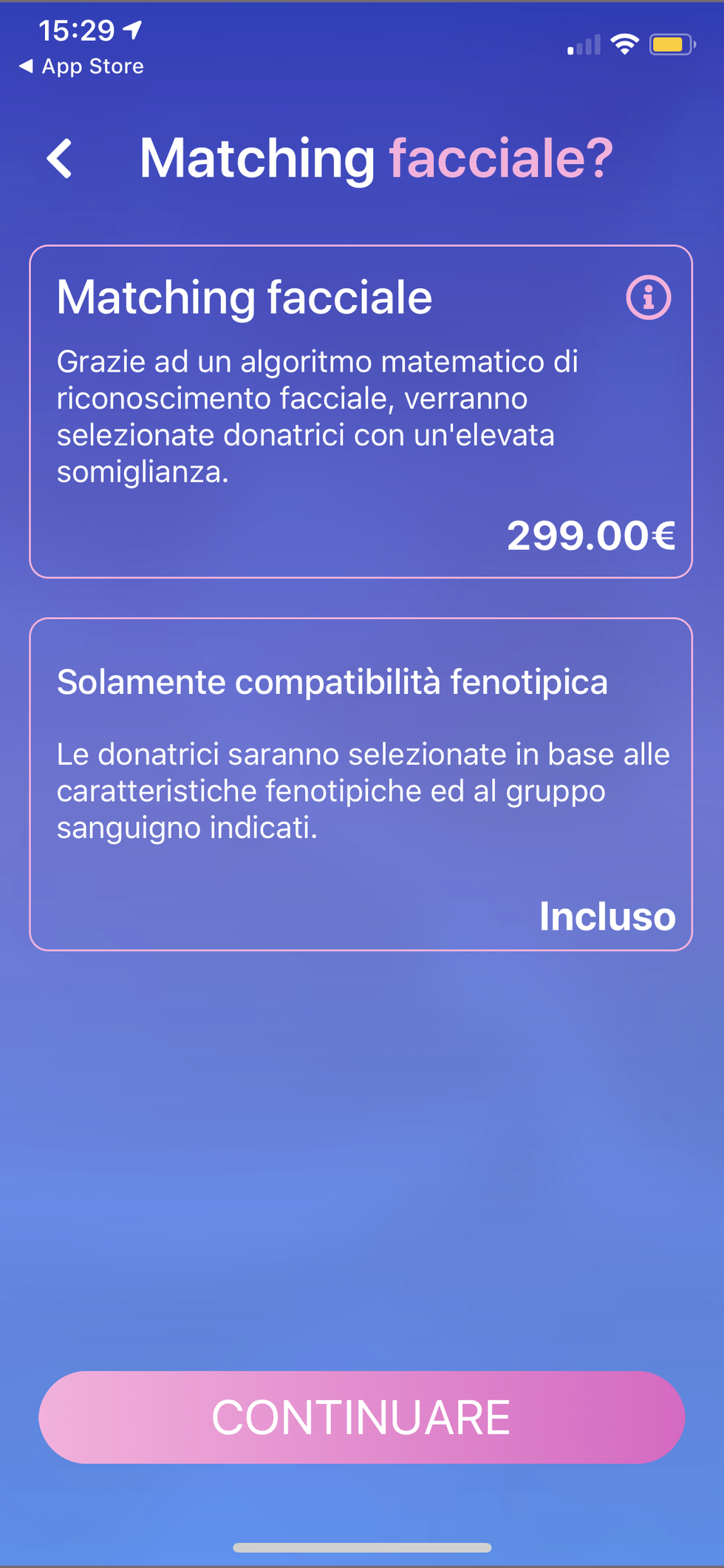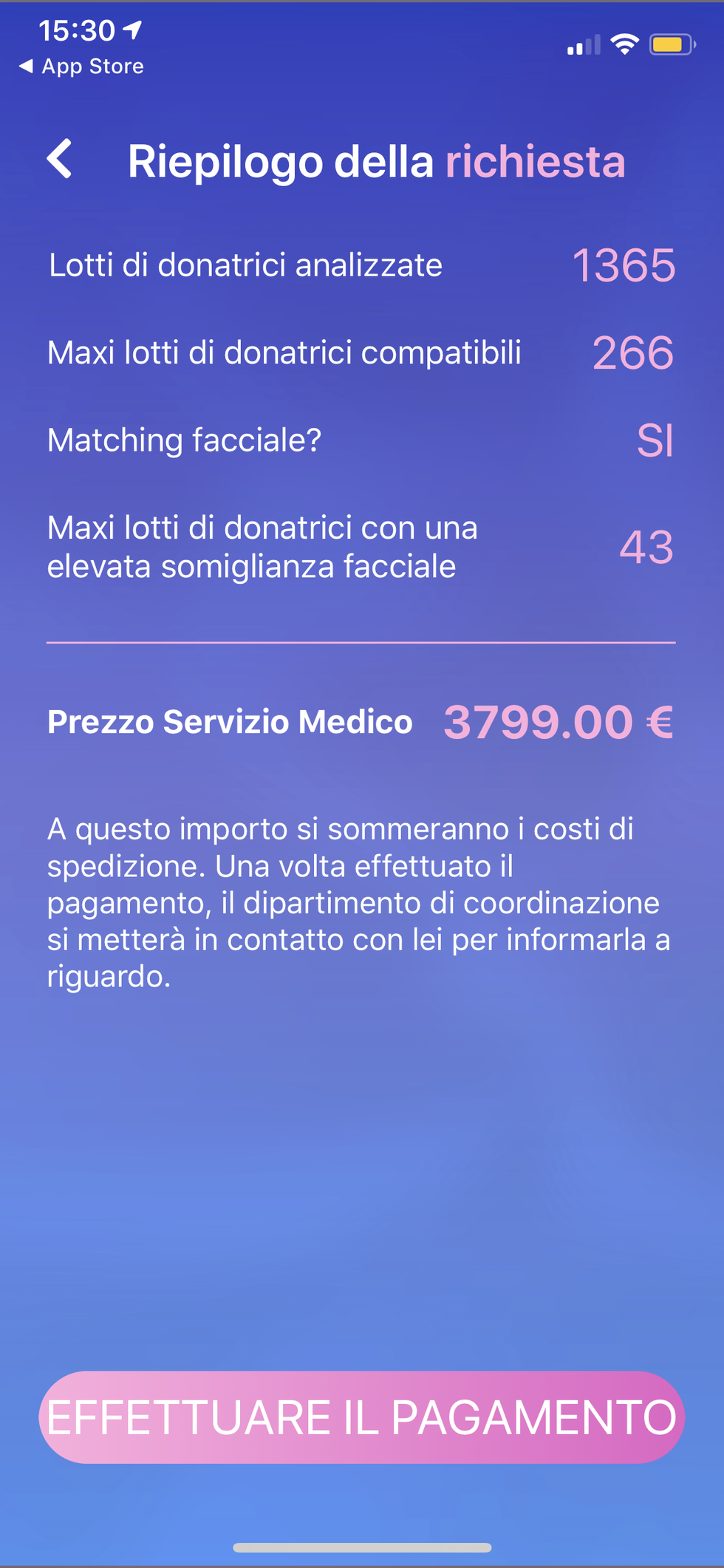 Abbiamo scaricato sul nostro smartphone l'applicazione per scoprire come funziona. Ovomatch è semplicissima nel complesso e richiede, come ovvio che sia in questi casi, molteplici dati. Si inizia come sempre da una registrazione semplice: indirizzo di posta elettronica e password. Nella seconda schermata, dopo un messaggio di benvenuto, Ovomatch spiega che per procedere saranno richiesti una serie di dati personali e fenotipici per cercare donatrici compatibili. Accettiamo e proseguiamo. Dopo nome, cognome, data di nascita e il proprio indirizzo, l'applicazione chiede l'inserimento di un documento di identità (passaporto o carta d'identità) affinché si possa procedere con la creazione del proprio profilo. Non solo. Nel caso in cui la ricerca di ovuli avvenga in coppia, Ovomatch richiede espressamente i medesimi dati anche per il partner. Una volta completati tutti gli spazi si passa ai dati fenotipici del ricevente. Etnia, gruppo sanguigno, colore dei capelli, degli occhi, della pelle, peso, altezza e tipologia di capello sono, secondo la banca di ovuli, i dati necessari per la ricerca della donatrice perfetta. Una volta completata la propria scheda, l'applicazione mostra i centri collaboratori più vicini al luogo in cui si vive. Nel nostro caso, Milano. Solo nel Nord Italia sono 12 le cliniche che collaborano con Ovobank. Fin qui, il procedimento è completamente gratuito. È solo nella settima schermata che si scoprono i primi prezzi del procedimento. Per un mini lotto (tre-quattro ovociti vetrificati) si parte da una cifra base di 1.500 euro. Il prezzo raddoppia per un lotto standard (sei-sette ovociti vetrificati) e passa a 3.500 euro per la versione maxi, composta da otto-nove ovociti. Selezioniamo il piano più costoso e subito veniamo reindirizzati in una pagina di transizione in cui cerchi concentrici e una clessidra indicano che Ovobank, ricevuti i nostri dati, sta provvedendo alla ricerca di donatrici fenotipicamente compatibili. Nel nostro caso la ricerca comprende 266 persone. Ma qui scatta l'innovazione. L'app, infatti, a questo punto offre la possibilità di effettuare un matching facciale al costo extra di 299 euro. Accettiamo e davanti a noi si apre una schermata simile alla fotocamera del nostro cellulare. A questo punto, ci scattiamo un selfie e lo inviamo a Ovomatch. Dopo circa un minuto scopriamo che delle 266 donne precedentemente selezionate solo 43 farebbero al caso nostro. L'ultima schermata ci riepiloga le nostre richieste con tanto di prezzo completo. Per un lotto di 1.365 donatrici analizzate, otto-nove ovociti e l'opzione matching facciale il costo della proceduta è di 3.799 euro, che si sommeranno ai costi di spedizione del pacchetto con i nostri probabili futuri figli.