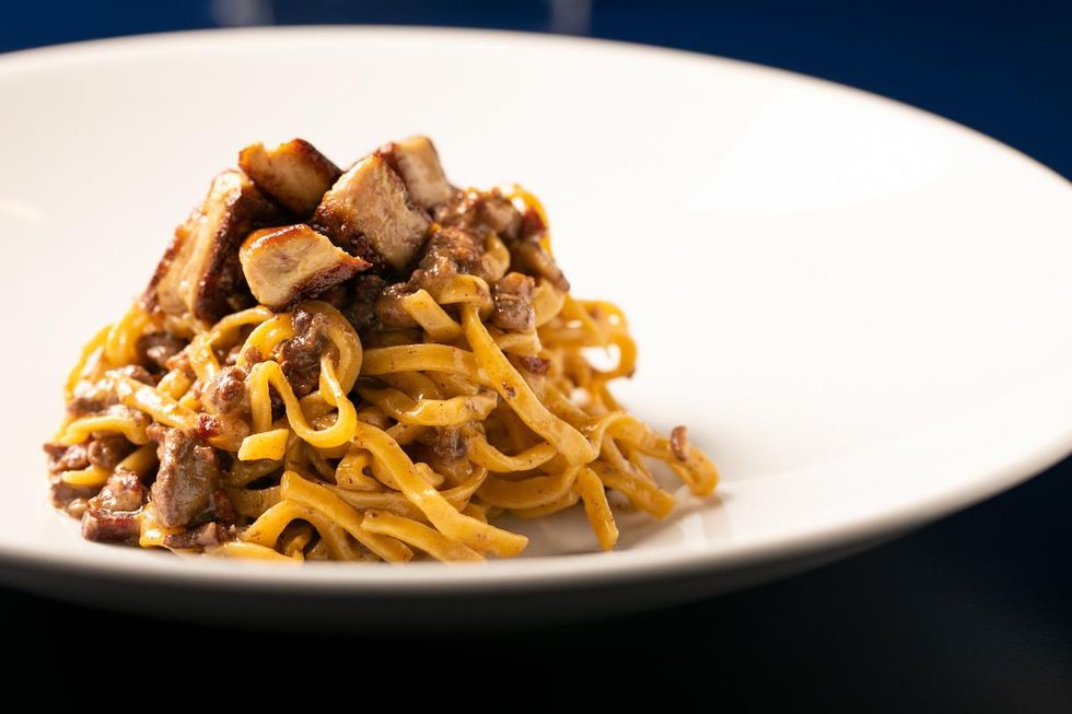 Tortelli ripieni di funghi e mascarpone, brodo di cappone e radici
