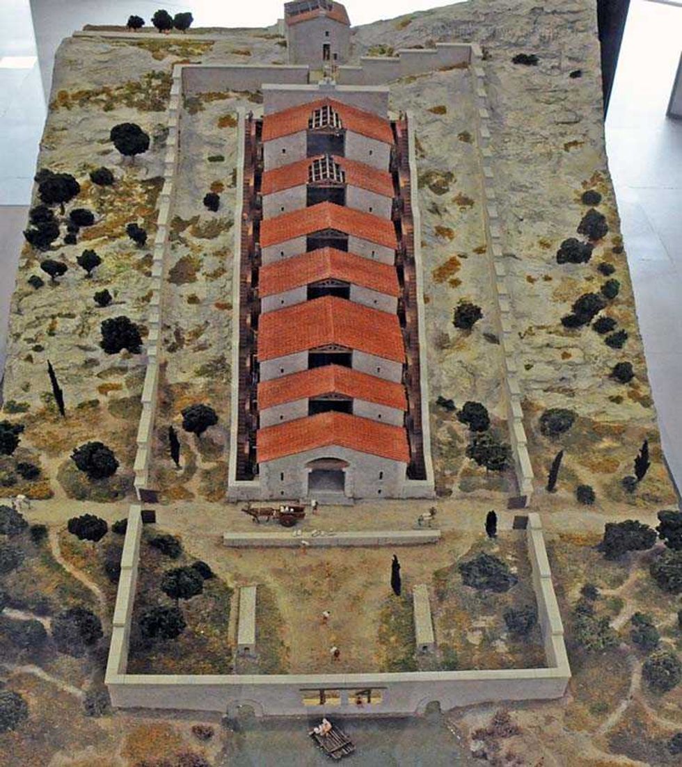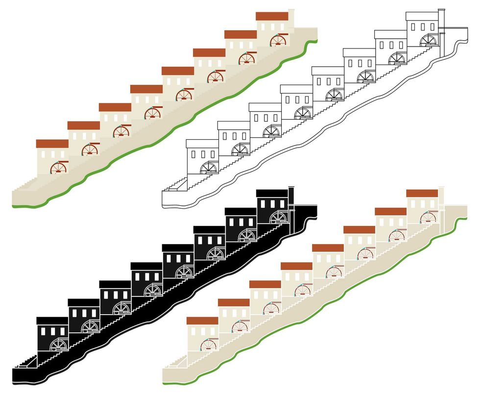 Un disegno che ricostruisce i 16 mulini in serie del sito industriale di Barbegal, nel Sud della Francia (Getty Images)