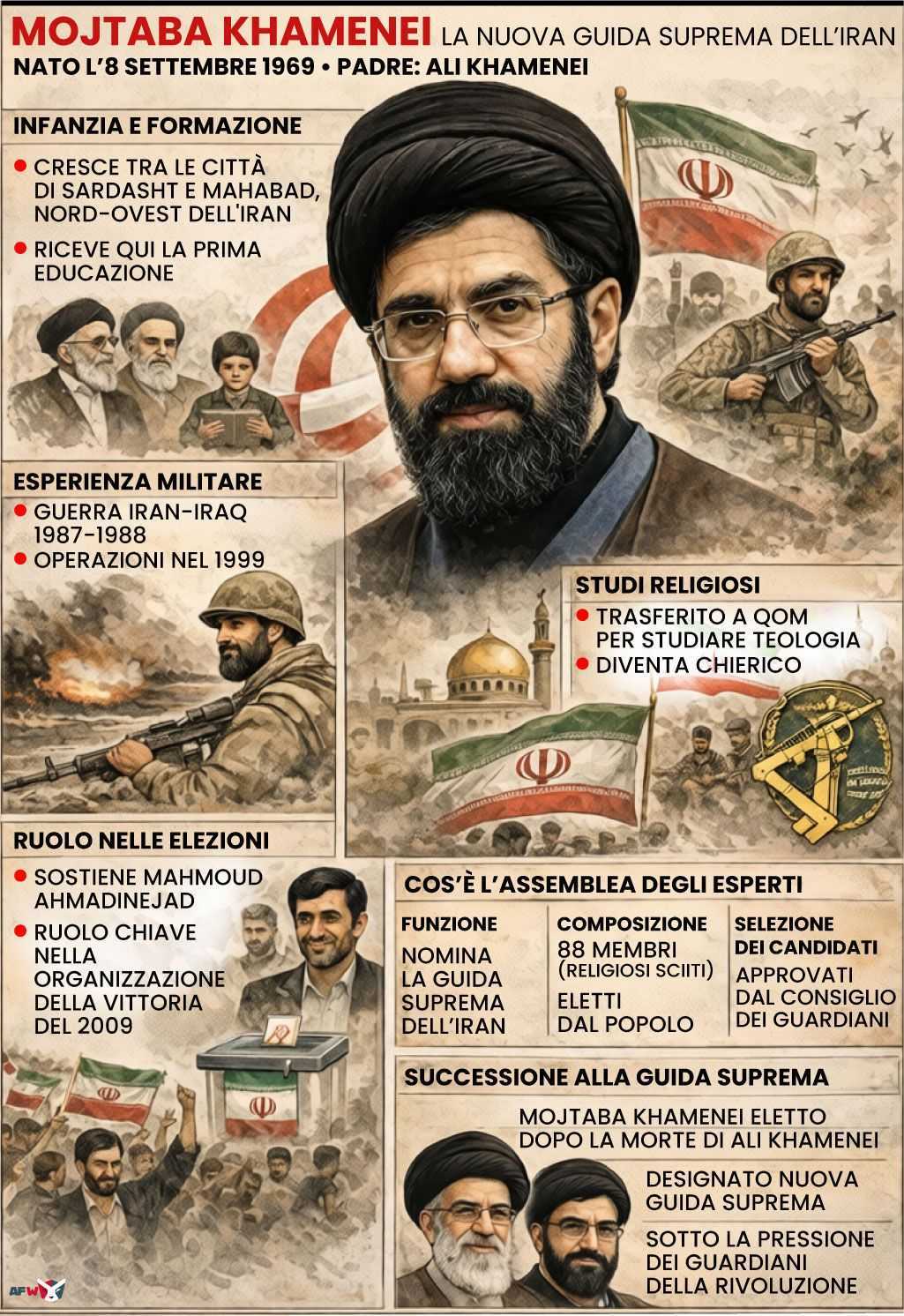 I media iraniani vicini all’opposizione indicano il figlio di Ali Khamenei, cresciuto nell’orbita dei Pasdaran e degli apparati di sicurezza, come successore della Guida Suprema dopo gli attacchi di Israele e Stati Uniti. Al momento, tuttavia, non esiste alcuna conferma ufficiale da parte delle autorità iraniane o dell’Assemblea degli Esperti.