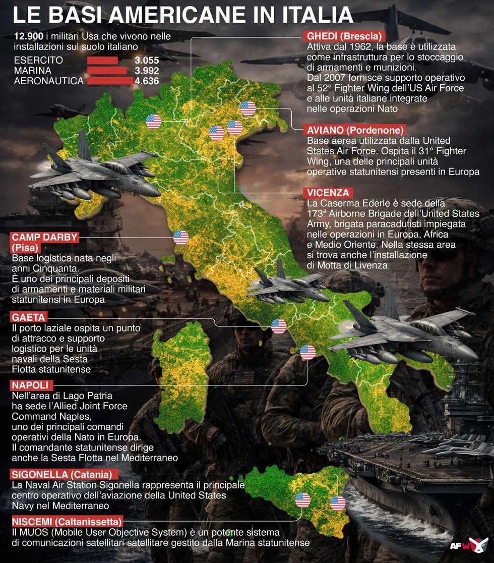 Altre infrastrutture completano la rete: il porto di Gaeta, che fornisce supporto logistico alle unità della Sesta Flotta statunitense nel Mediterraneo; Napoli, dove ha sede la Naval Support Activity e uno dei principali comandi operativi della Nato; e la base di Ghedi, in Lombardia, utilizzata per attività di supporto e stoccaggio di armamenti nell’ambito delle operazioni dell’Alleanza Atlantica.