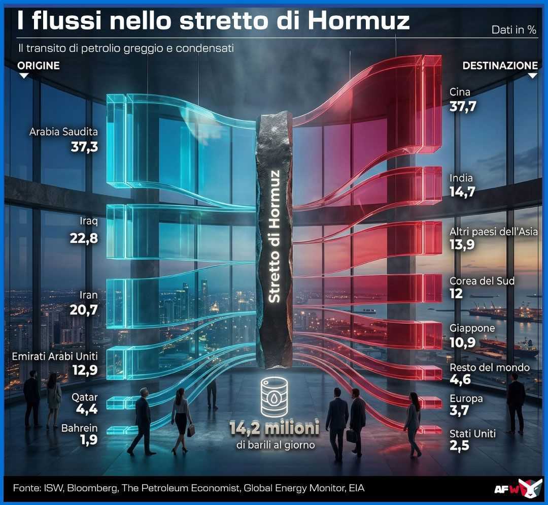 Lo Stretto di Hormuz rimane il grimaldello della geopolitica energetica. Nel 2016, ha registrato il transito record di 18,5 milioni di barili al giorno, pari a quasi un terzo di tutto il greggio trasportato via mare. La sua importanza è vitale per l’Asia: in condizioni normali, ossia non quelle delle settimane in cui stiamo vivendo, l’80% del greggio che attraversa questo braccio di mare tra Iran e Oman è diretto verso mercati affamati come Cina, Giappone, India e Corea del Sud. Non solo: fino a prima della guerra, il Qatar vi faceva transitare 3,7 trilioni di metri cubi di gas naturale liquefatto, coprendo oltre il 30% del commercio globale di settore.