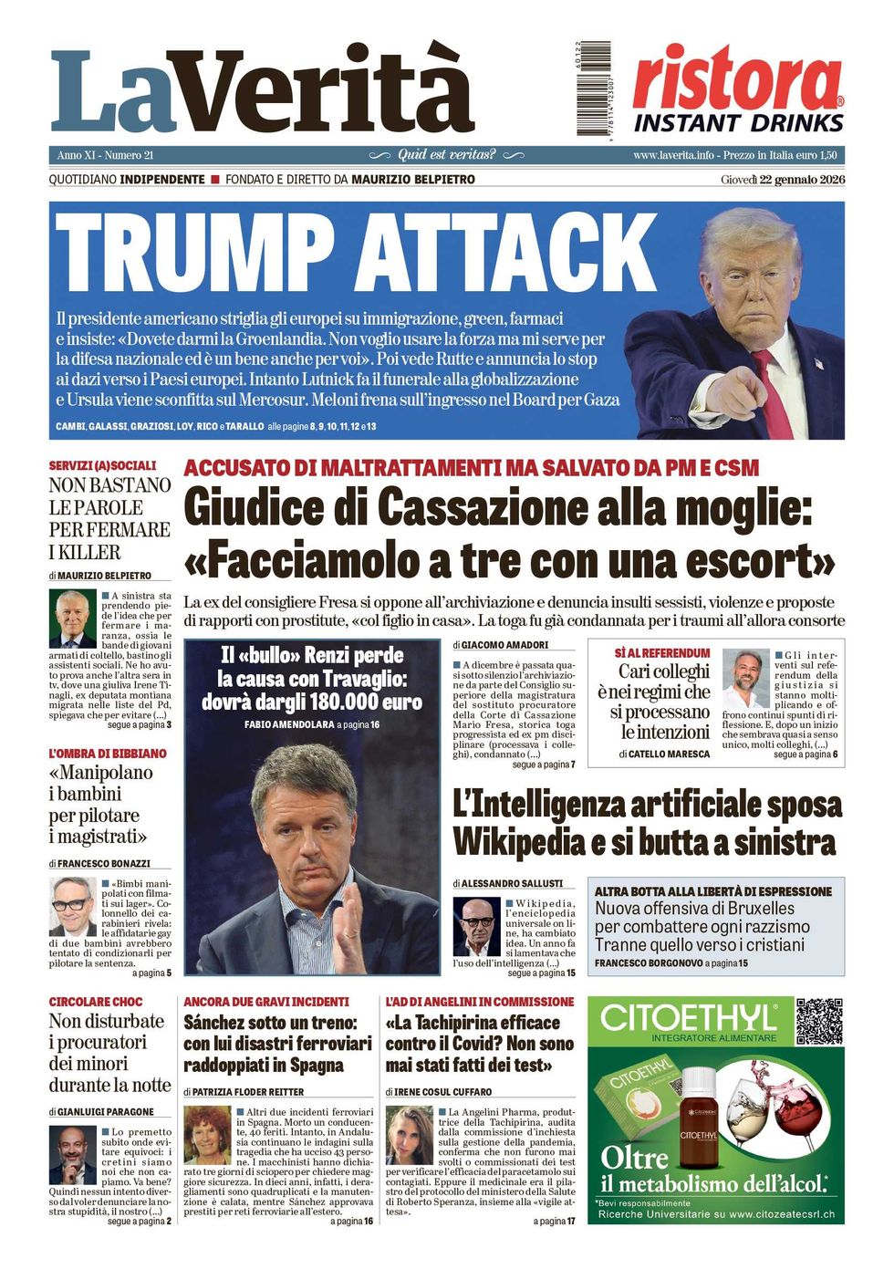 Il presidente americano striglia gli europei su immigrazione, green, farmaci e insiste: «Dovete darmi la Groenlandia. Non voglio usare la forza ma mi serve per la difesa nazionale ed è un bene anche per voi». Poi vede Rutte e annuncia lo stop ai dazi verso i Paesi europei. Intanto Lutnick fa il funerale alla globalizzazione e Ursula viene sconfitta sul Mercosur. Meloni frena sull’ingresso nel Board per Gaza.
