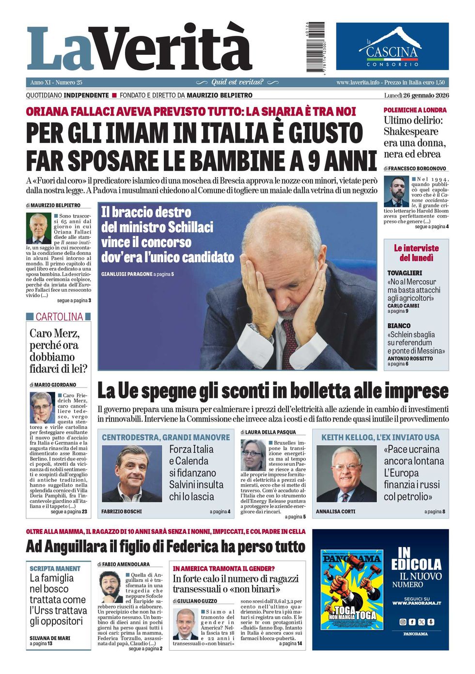 Ribadisco: il saggio di Oriana Fallaci risale a 65 anni fa. Ma da allora nulla sembra essere cambiato. Nei Paesi musulmani spesso le donne vanno in sposa a uomini che nemmeno conoscono. A decidere chi debba essere il loro marito sono i genitori e se le figlie si ribellano rischiano di finire sottoterra, come è capitato a Saman e a Hina. Assassinate dai parenti perché rifiutavano un matrimonio combinato. Non in Pakistan, ma in Italia. E proprio a Brescia, dove una giovane di vent’anni fu sgozzata dal padre e sepolta in giardino perché rifiutava le nozze, la trasmissione condotta da Mario Giordano su Rete 4 è andata a chiedere agli imam se sia giusto che un adulto di 30 o 40 anni sposi una bambina di nove. Le risposte date all’inviato di Fuori dal coro sono state agghiaccianti. Per i capi religiosi della comunità islamica di Brescia è normale che una minorenne venga costretta a sposarsi con un uomo molto più anziano di lei. La legge in tutto il mondo civilizzato vieta i matrimoni di bambine con persone adulte e punisce anche i rapporti sessuali con minorenni, ma gli imam interpellati dal giornalista del programma di Giordano non sembrano turbati dal divieto. «È il Corano a consentirlo» si giustificano, aggiungendo che il profeta prese una sposa che aveva appena 12 anni. Secondo loro, il matrimonio è una cosa buona e giusta e per legalizzarlo, registrandolo ufficialmente, è sufficiente aspettare che la «moglie» compia 18 anni, in mondo da non disturbare la legge. «È una cosa bella» commentano senza sapere di essere registrati quando l’inviato dice di aver sposato una ragazzina di 12 anni. Però, quando il giornalista rivela la sua identità e non nasconde più la telecamera, la versione si fa più prudente. All’improvviso gli imam che prima lodavano il matrimonio fra bambine e adulti, promuovendolo quasi si trattasse della sublimazione di un’unione tra uomo e donna, dicono di non sapere nulla delle spose bambine. Di fronte alla cinepresa non rivendicano più le nozze con minorenni obbligate a sposare degli sconosciuti per decisione dei genitori. A microfoni aperti diventano rispettosi della legge.