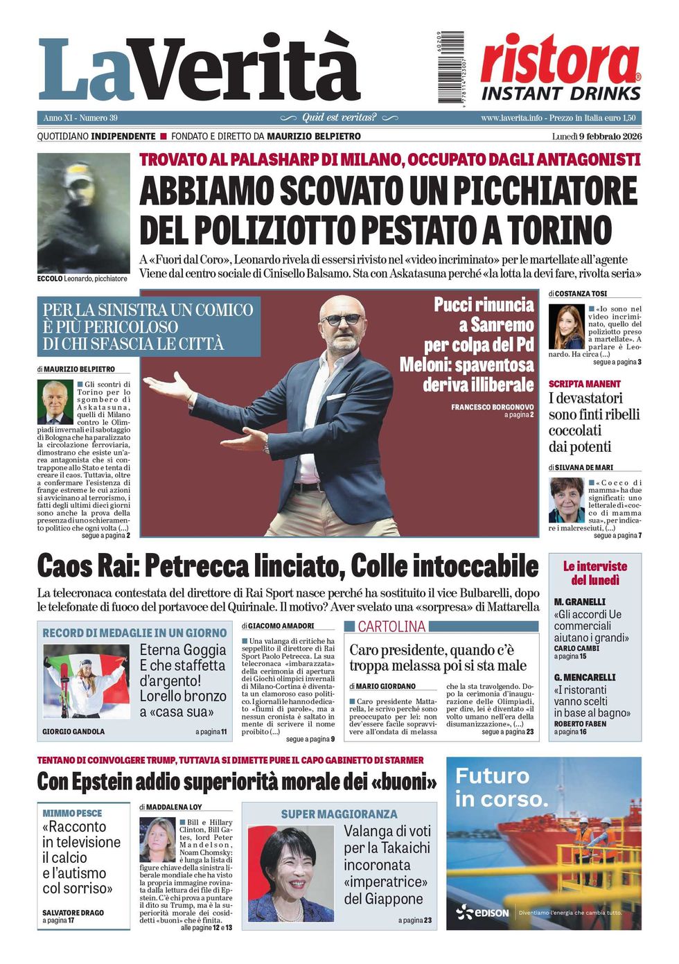 Non solo i treni, anche Milano è stata messa a ferro e fuoco in occasione dell’inizio dei Giochi. «Dopo che altri hanno tranciato i cavi della ferrovia per impedire ai treni di partire, solidarietà, ancora una volta, alle forze dell’ordine, alla città di Milano, e a tutti coloro che vedranno il loro lavoro vanificato da queste bande di delinquenti», ha commentato il presidente del consiglio Giorgia Meloni, ricordando che «migliaia e migliaia di italiani in queste ore lavorano perché tutto funzioni durante le Olimpiadi. Tantissimi lo fanno da volontari, perché vogliono che la loro nazione faccia bella figura, che sia ammirata e rispettata. Poi ci sono loro: i nemici dell’Italia e degli italiani, che manifestano “contro le Olimpiadi”, facendo finire queste immagini sulle televisioni di mezzo mondo». Severa e durissima anche la reazione del ministro della Difesa Guido Crosetto, che sui social in un lungo post ha scritto ironizzando: «Non sono pericolosi delinquenti quelli che hanno tagliati i cavi per non far partire i treni ed hanno manifestato con violenza contro le Olimpiadi. No». E poi la condanna: «Chi si comporta come ieri a Milano o la settimana scorsa a Torino non lo fa contro il governo pro tempore, lo fa contro lo Stato, la Repubblica, l’Italia. Tollerarlo significa indebolire l’Italia non la Meloni».