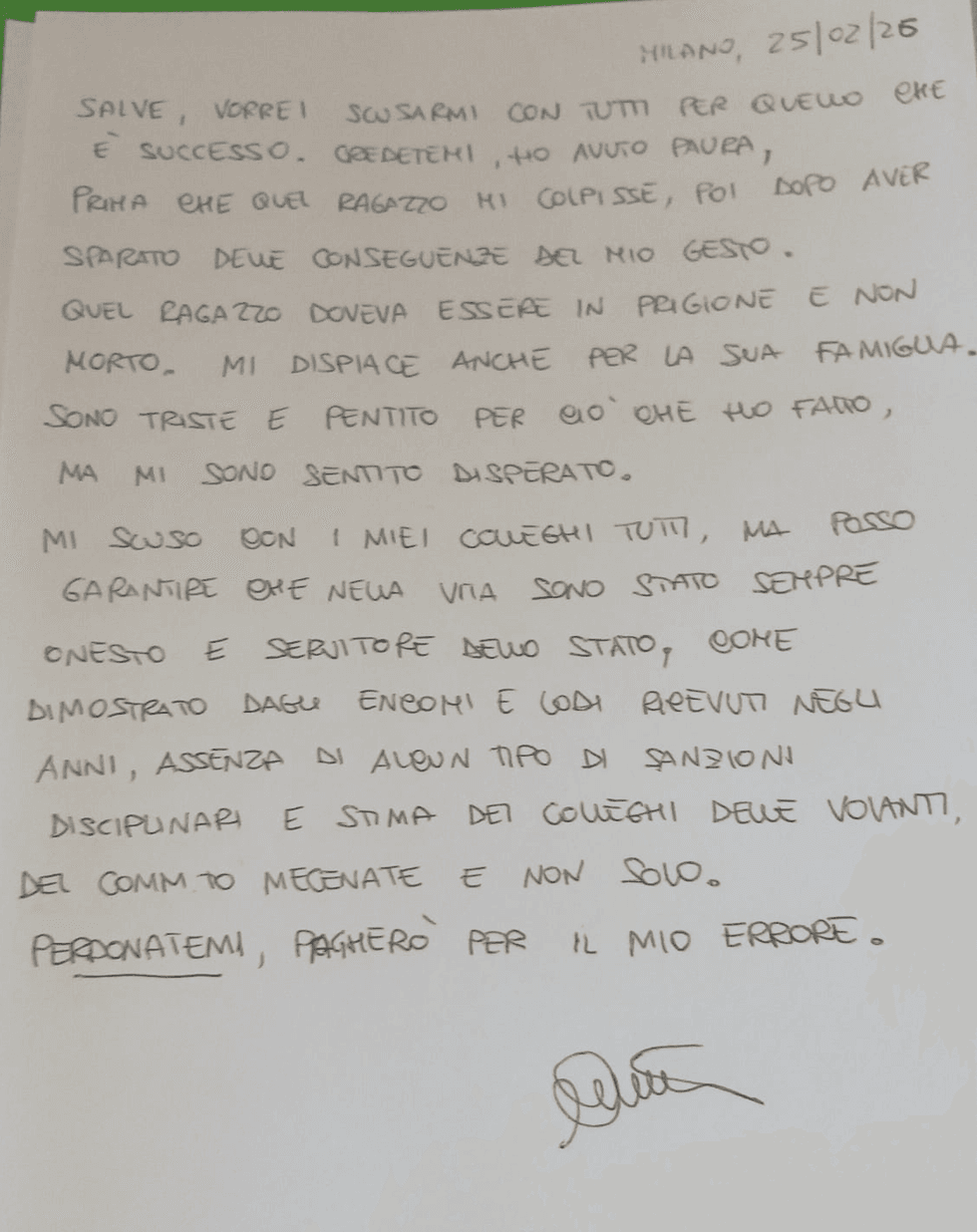 In una lettera scritta dal carcere, Cinturrino chiede scusa «a tutti per quello che è successo», spiegando di aver «avuto paura» e di essersi poi sentito «disperato». «Quel ragazzo doveva essere in prigione e non morto», scrive, esprimendo pentimento e dolore anche per la famiglia di Mansouri. Rivendica di essere stato «sempre onesto e servitore dello Stato», ricordando encomi e assenza di sanzioni disciplinari, e conclude: «Perdonatemi, pagherò per il mio errore». La famiglia di Mansouri respinge le scuse: «Ammazzare una persona e poi creare una messinscena non è un errore». Se le accuse fossero confermate, aggiungono, l’agente «avrebbe dovuto essere arrestato molto tempo fa». E puntano il dito anche sui colleghi: se qualcuno avesse denunciato prima, «Abderrahim oggi sarebbe vivo».
