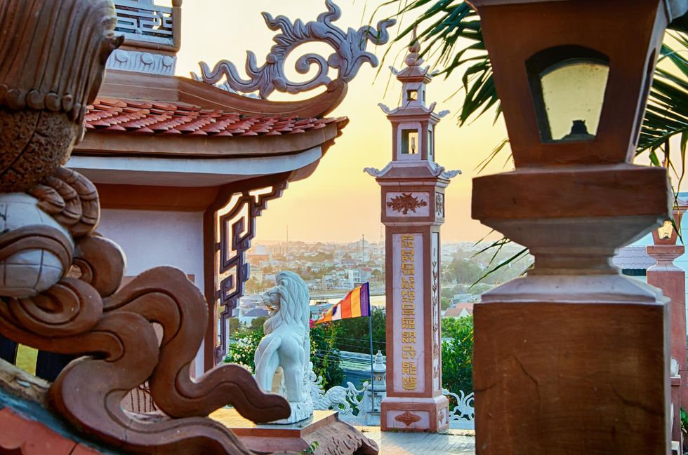 Un'opulenta fenice si libra nella calura mentre un diligente custode sciacqua delicatamente la sabbia dai suoi artigli a mosaico. Acri su acri di draghi urlanti si sfidano per la superiorità, mentre croci dorate e svastiche buddiste svettano nel cielo del pomeriggio. Queste sono le ville di coloro che ci sono stati portati via. Questa è la Città degli Dei del Vietnam.