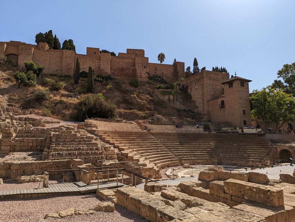 l teatro romano di Malaga si trova in una posizione spettacolare ai piedi della cittadella moresca della città, o Alcazaba. Fu scoperto nel 1951, durante la costruzione di un centro culturale che fu poi demolito 40 anni dopo, per mostrare i resti del teatro in tutto il loro splendore. La struttura risale al I secolo d.C., durante il governo di Augusto (27 a.C. - 14 d.C.), e fu in uso fino al III secolo. Nell'VIII secolo, il sito fu saccheggiato dai Mori, che utilizzarono le colonne per rinforzare le mura e le fondamenta della loro potente Alcazaba. Il sito ospita un piccolo centro di interpretazione e, in estate, la rovina torna alla sua funzione originaria, con oltre 200 posti a sedere per gli spettatori.