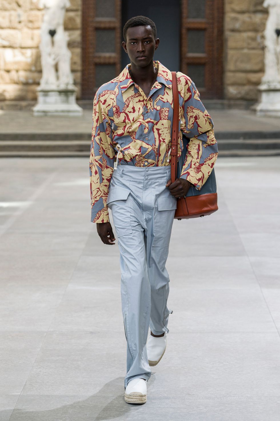 È il brand fiorentino Salvatore Ferragamo che prende possesso di diritto di uno dei luoghi più famosi al mondo. Passerella tenuta d'occhio dal David di Michelangelo e dal Perseo di Benvenuto Cellini, che se ne sta nella Loggia dei Lanzi. La collezione è il debutto per il menswear di Paul Andrewn, direttore creativo della maison. Si mescola con sapienza: il parka prende il posto di un classico blazer, il jeans cinque-tasche è in pelle e con gamba ampia mentre il pantalone ha un fit morbido. Cosi come la giacca sartoriale è interpretata in chiave sportiva.