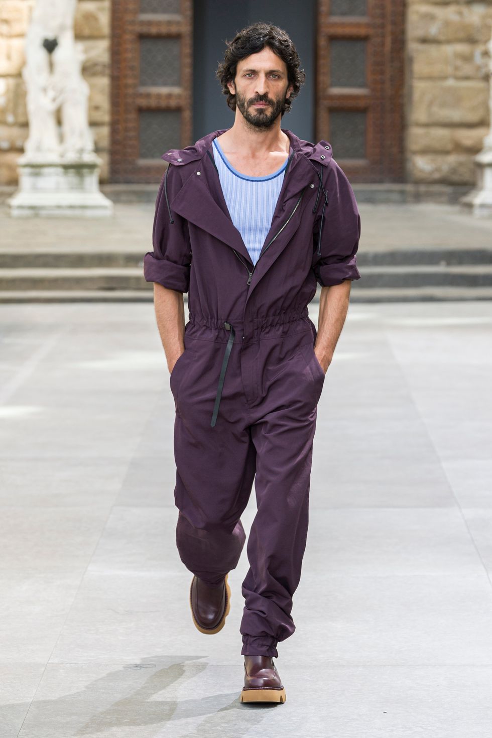 È il brand fiorentino Salvatore Ferragamo che prende possesso di diritto di uno dei luoghi più famosi al mondo. Passerella tenuta d'occhio dal David di Michelangelo e dal Perseo di Benvenuto Cellini, che se ne sta nella Loggia dei Lanzi. La collezione è il debutto per il menswear di Paul Andrewn, direttore creativo della maison. Si mescola con sapienza: il parka prende il posto di un classico blazer, il jeans cinque-tasche è in pelle e con gamba ampia mentre il pantalone ha un fit morbido. Cosi come la giacca sartoriale è interpretata in chiave sportiva.