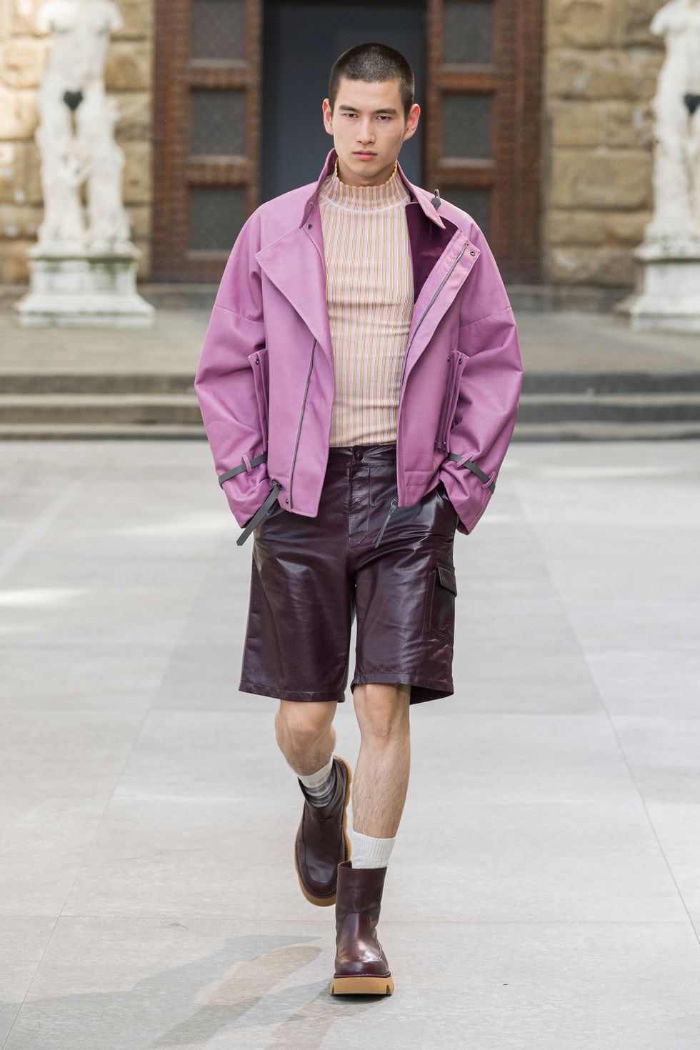 È il brand fiorentino Salvatore Ferragamo che prende possesso di diritto di uno dei luoghi più famosi al mondo. Passerella tenuta d'occhio dal David di Michelangelo e dal Perseo di Benvenuto Cellini, che se ne sta nella Loggia dei Lanzi. La collezione è il debutto per il menswear di Paul Andrewn, direttore creativo della maison. Si mescola con sapienza: il parka prende il posto di un classico blazer, il jeans cinque-tasche è in pelle e con gamba ampia mentre il pantalone ha un fit morbido. Cosi come la giacca sartoriale è interpretata in chiave sportiva.