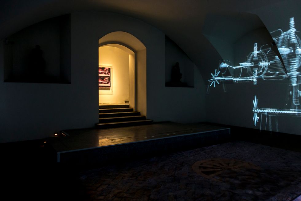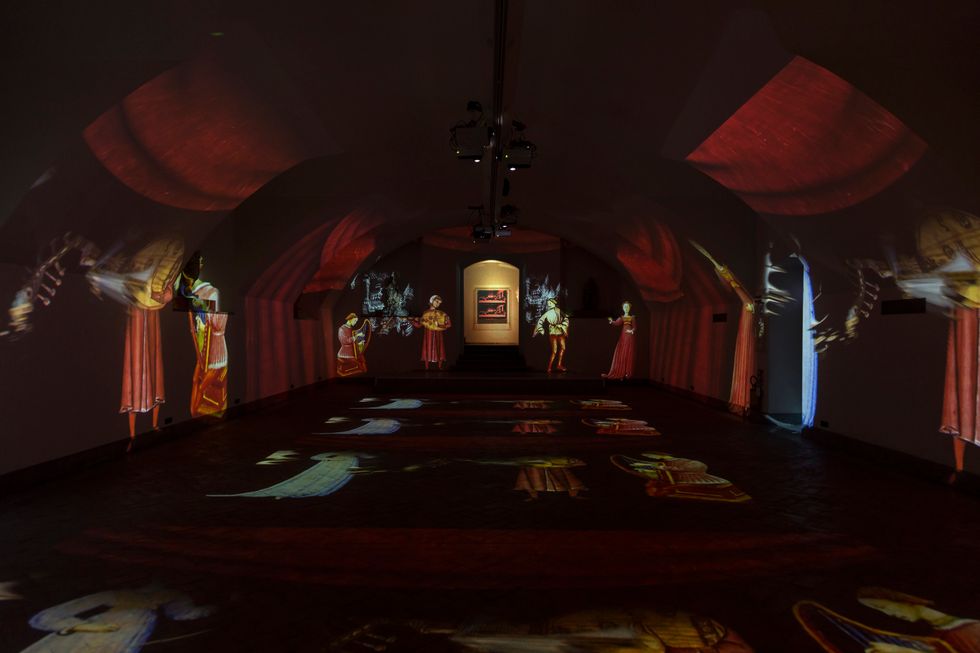 2. Sala immersiva, dove pareti di proiezione alte circa 6 metri e lunghe dai 15 ai 40 metri avvolgono lo spazio. Questo è lo spazio dove l'opera multimediale che abbiamo realizzato si sviluppa raccontando in modo creativo le opere degli artisti in una successione di capitoli caratterizzati ciascuno da una differente idea grafica. La caratteristica di questa sala è di essere vissuta dal pubblico come una dimensione collettiva, con gli spettatori seduti al centro della scena avvolti da suoni, musica e immagini.