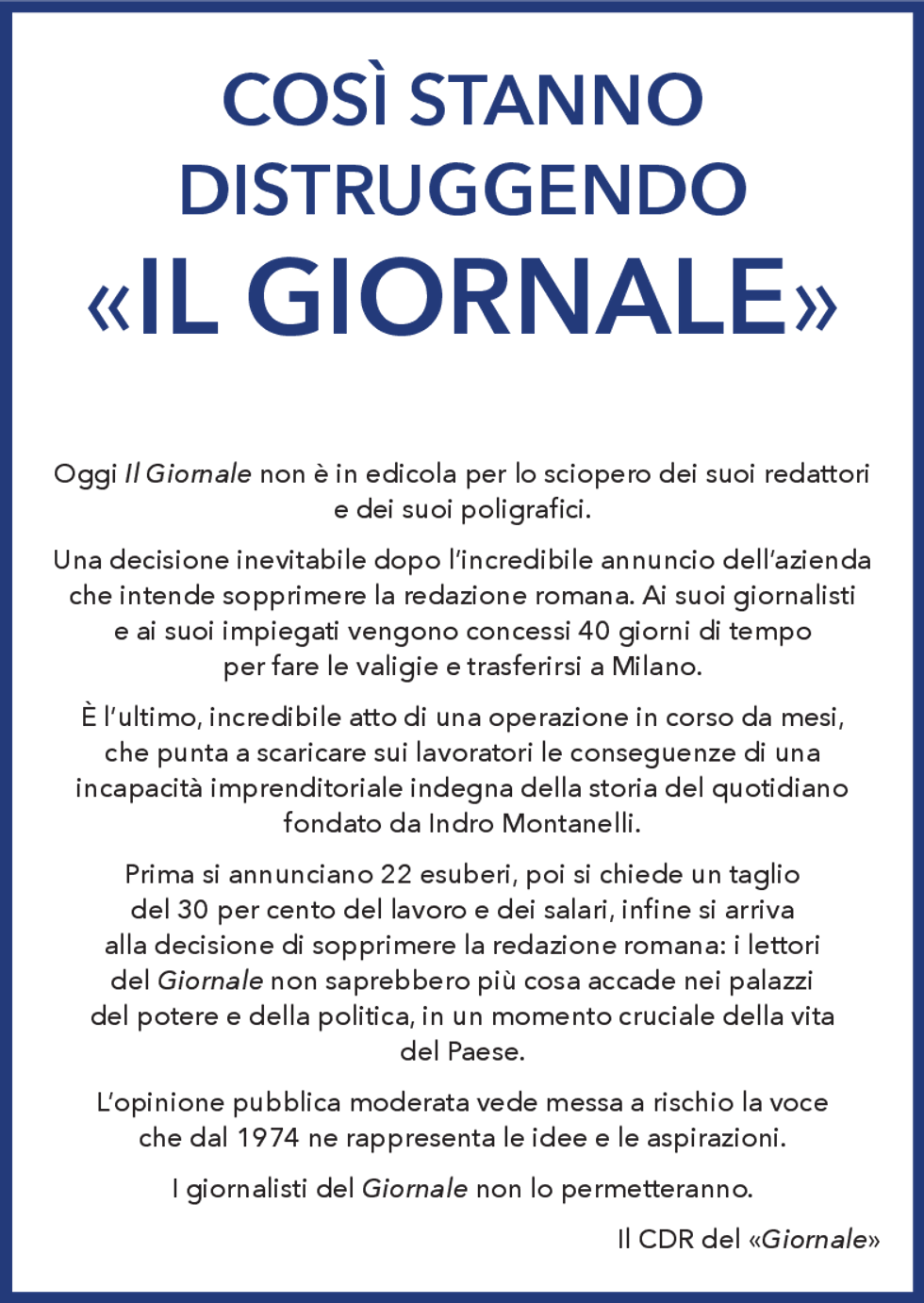Dopo mesi e mesi di incertezza per la redazione romana del Giornale è arrivata la notizia della chiusura. A comunicarlo è stato direttamente l'editore del quotidiano fondato da Indro Montanelli nel 1974, ovvero la Società europea di edizioni. Restano in bilico, dunque, le posizioni di 18 giornalisti e tre poligrafici, ai quali è stato dato tempo fino al 30 aprile per trasferirsi nella sede milanese del quotidiano. A tale notizia ha fatto seguito l'immediata reazione del Comitato di redazione (Cdr), il quale ha diffuso il seguente comunicato: «Le rappresentanze sindacali deprecano e respingono la decisione, arrivata dopo mesi di trattative sulla riduzione del costo del lavoro giornalistico, durante le quali i dipendenti del quotidiano hanno dimostrato la massima disponibilità. Ai dipendenti poligrafici una ipotesi analoga era stata semplicemente ventilata e mai neppure formalizzata. L'azienda, con un vero e proprio ricatto, mette i lavoratori e le loro famiglie davanti alla scelta secca tra le dimissioni e il trasferimento coatto da Roma a Milano. La chiusura della redazione del giornale si configura come una rappresaglia di un management poco abituato a relazioni industriali collaborative. La soppressione della redazione romana rappresenta la perdita di un punto di riferimento culturale e politico e segna il tramonto di una lunga stagione editoriale. La scelta non porta alcun beneficio economico ai conti del quotidiano, anzi rischia di relegarlo a un ruolo di foglio senza più ambizioni nazionali. La redazione di Roma è sempre venuta incontro alle esigenze economiche e strutturali del giornale, con un progetto riuscito di integrazione sul lavoro di desk tra Roma e Milano».