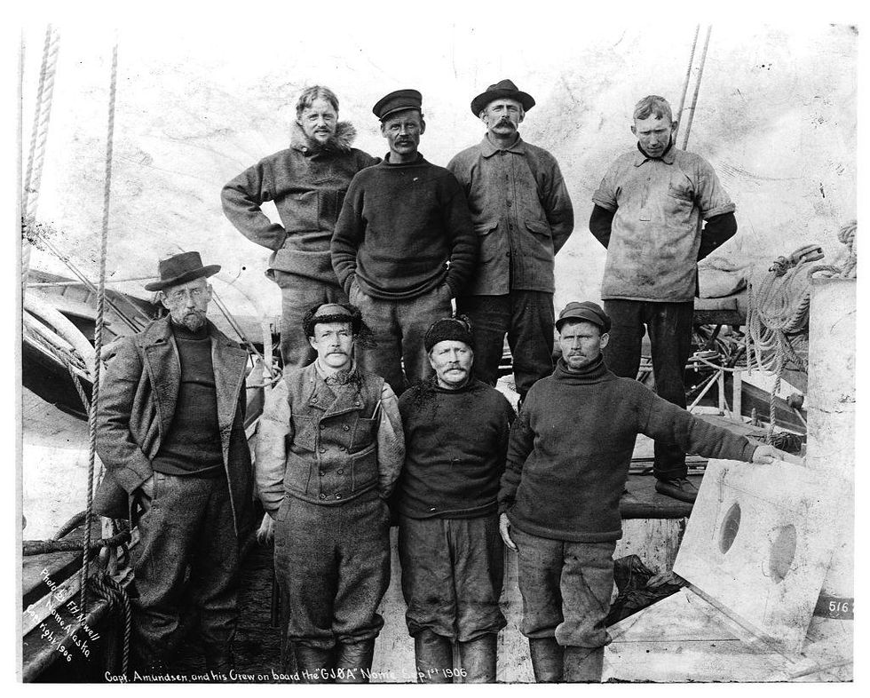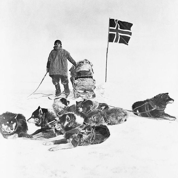 Era il 14 dicembre 1911 quando la bandiera norvegese sventolò per prima al Polo Sud, frustata dal vento gelido dell’Antartide. Accanto a lui posavano due uomini, quasi irriconoscibili per l'abito fatto di pelli e pellicce che ne copriva integralmente le figure. L’ultima grande conquista geografica, che chiuse l’era delle esplorazioni cominciata alla fine del XV secolo, era compiuta. Il vincitore, uno dei due uomini ritratti nella fotografia, era un norvegese: Roald Engelbregt Gravning Amundsen, nato a Borge il 16 luglio 1872.