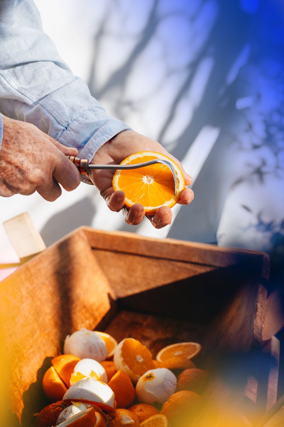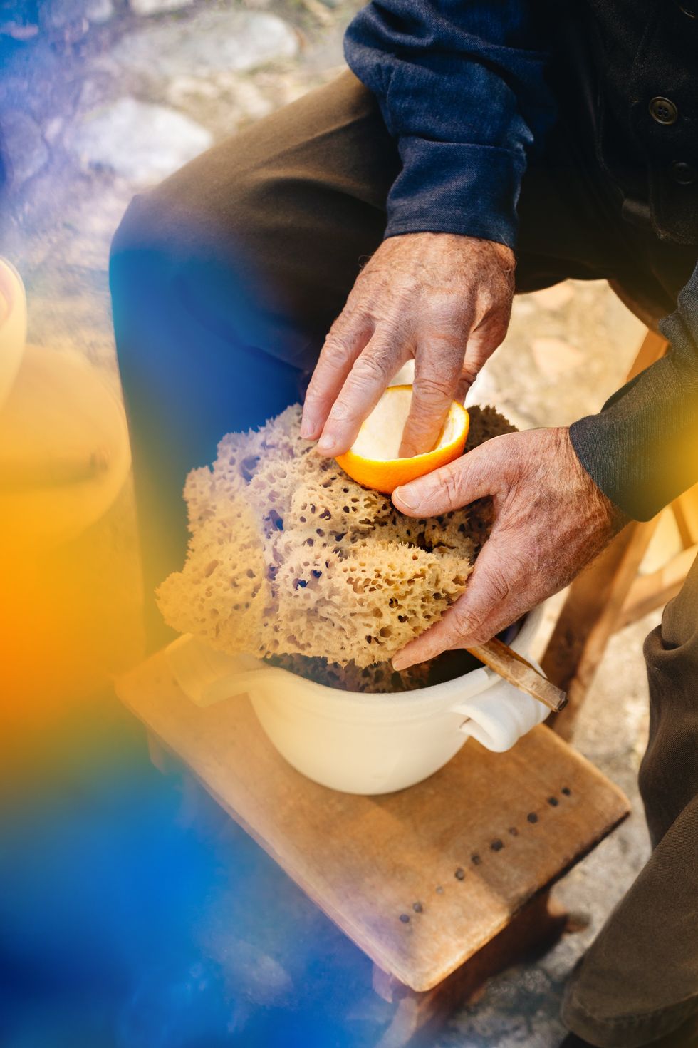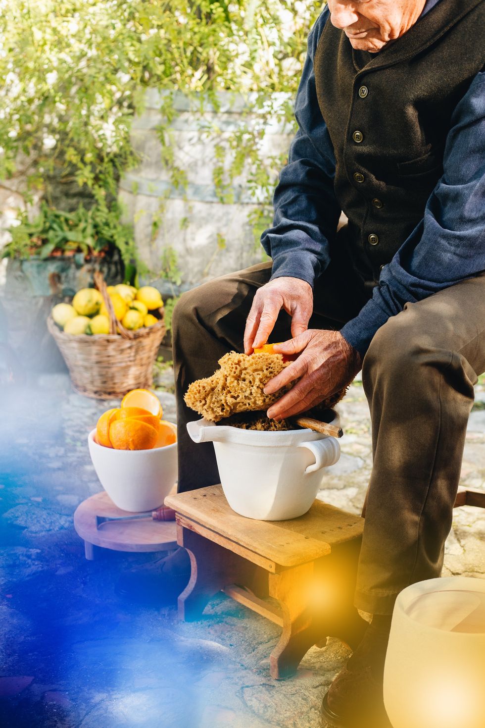 La Spugnatura inizia quando l’artigiano taglia in due metà uguali il frutto, con un coltello ben affilato. Successivamente, usando un utensile simile a un cucchiaio chiamato “cavatore”, separa la polpa dalla buccia. Subito dopo, le scorze di arancia vengono strofinate, a mano, su spugne marine, che ne assorbono tutta l’essenza. Nella fase finale, l’artigiano strizza le spugne, ricche di olio essenziale, con movimenti precisi, e raccoglie l’elisir agrumato in contenitori di terracotta.