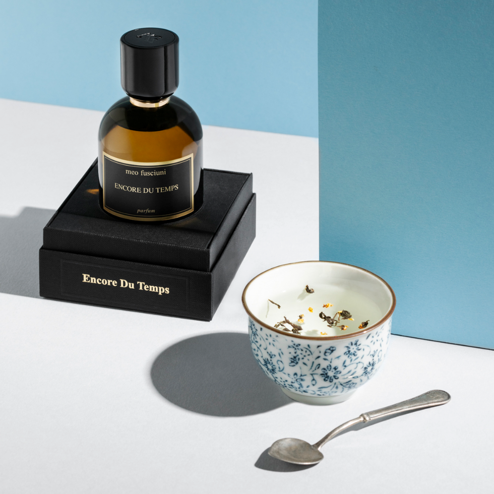 Encore du temps si sofferma per la prima volta, tra i temi cari a Meo Fusciuni, sul sentimento d’amore ed è il secondo capitolo della collezione Trilogia senza Tempo, dedicata al viaggio fisico e mentale attraverso tre differenti mondi olfattivi, l’India, il Laos e il Giappone.
