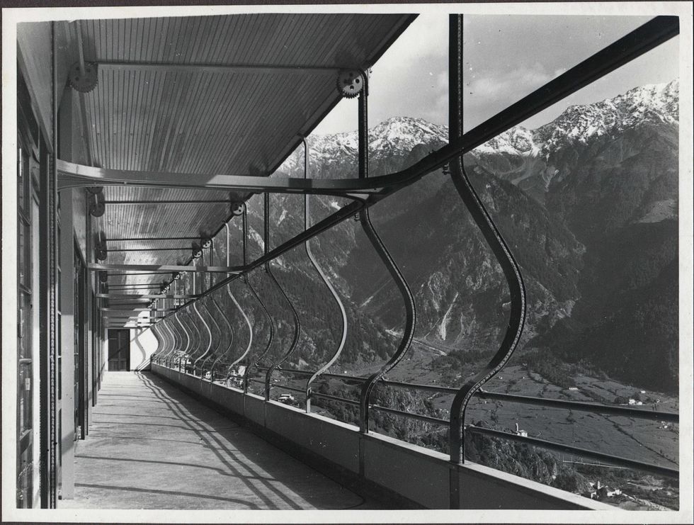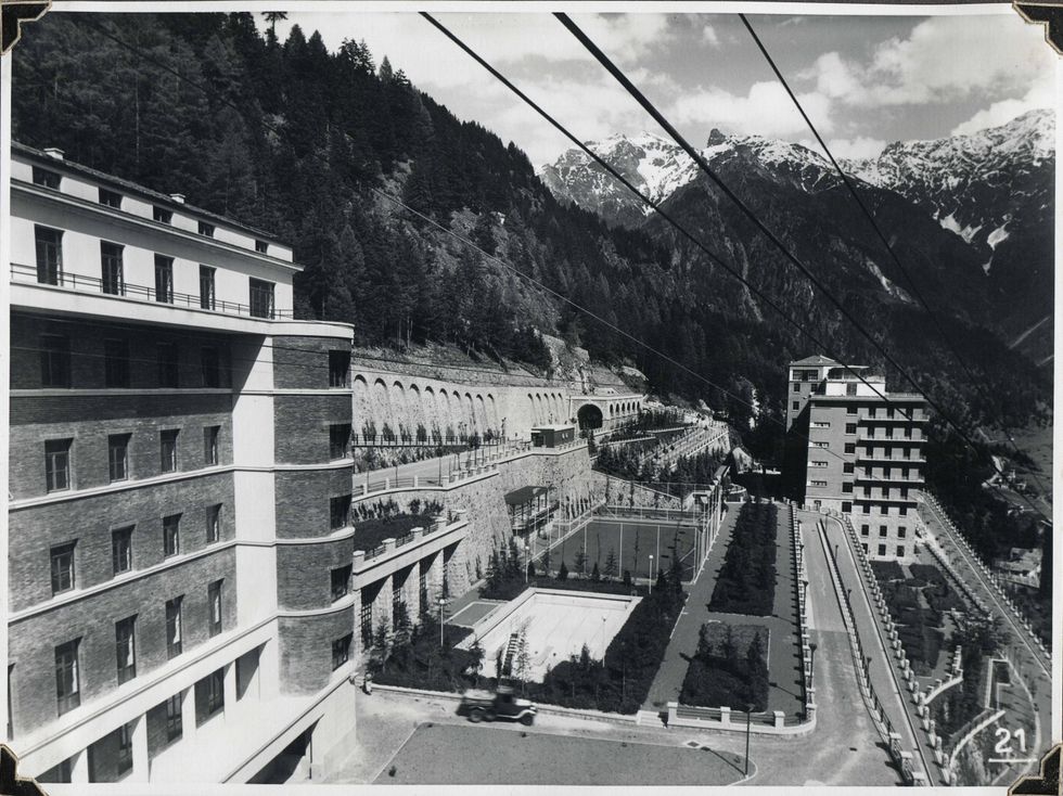 La storia dell’attuale ospedale «Eugenio Morelli» può essere letta come una sintesi della collaborazione tra medicina, tecnica, urbanistica e architettura. Il progetto prevedeva un totale di 10 edifici principali, di cui 8 riservati al ricovero dei pazienti e due alla logistica e ai servizi amministrativi. Ciascuno diverso per forma e struttura, ogni padiglione fu un esercizio di stile per la nascente architettura modernista, dalle cui correnti si svilupperanno gli architetti e gli stili caratterizzanti il secondo dopoguerra. La cubatura complessiva dei padiglioni superò i 600.000 mc, per realizzare i quali furono necessari complessi lavori di sbancamento della montagna per rendere accessibile il villaggio sanitario e un attento studio della nuova rete viaria tra gli edifici, dato lo sviluppo verticale dell’area. Tra gli aspetti più rilevanti e innovativi della rete viaria e di accesso sono l’uso di materiali di pregio di estrazione locale e i grandi colonnati ad arco (che ricordavano quelli delle strade e degli acquedotti della Roma classica) per il sostegno alle strade interne ricavate nel fianco della montagna, collegate tra loro e intervallate da rampe e piazze decorate da fontane e pergolati e segnate dalla presenza di diverse specie arboree lungo il loro tracciato, soprattutto tigli, aceri ed olmi. Fondamentale per le terapie dell’epoca, l’ospedale fu dotato di un grande parco di 400mila mq. diviso in un’area settentrionale a bosco di conifere e quella meridionale con 32 giardini terrazzati realizzati dallo scavo della montagna. I padiglioni, diversi l’uno dall’altro nelle linee e nei criteri costruttivi, rappresentano lo stile unico dell’ospedale di Sondalo. Tra questi, particolare attenzione merita il padiglione chirurgico a forma di «nave», una scelta stilistica tipica del modernismo architettonico anni ’30. La collocazione distopica rispetto all’ambiente montano e i colori pastello evidenziati dalle ringhiere azzurre spezzano il paesaggio prevalentemente sui toni verdi creando quasi un effetto pittorico, una «macchia mediterranea» nel cuore delle alture valtellinesi. Quattro padiglioni, quelli riservati alle lungodegenze, furono costruiti invece seguendo uno «standard» imposto dal ministero della Salute di Roma. Tuttavia, immersi nel paesaggio di montagna ed edificati su livelli sfalsati a causa del terreno impervio, danno all’occhio un’impressione ben diversa dai padiglioni simili edificati in pianura. Alti otto piani, di cui tre nella roccia e cinque fuori terra, sperimentarono per primi l’uso di un sistema automatizzato di chiusura delle grandi verande dedicate ai pazienti. L’innovazione tecnologica, che fece del villaggio sanatoriale un esempio ammirato nel mondo, caratterizzò anche il grande padiglione dei servizi. Nelle immagini d’epoca, visibili nella fotogallery in fondo all’articolo, salta all’occhio una rete di funi metalliche che collegavano il padiglione con gli altri edifici posti a una quota inferiore. Guardando bene, si capisce che quei cavi metallici erano parte di una estesa rete di teleferiche lungo la quale scorrevano numerosi carrelli merci. Progettate e realizzate dalla Ceretti & Tanfani di Milano, tutte le teleferiche convergevano al tetto del padiglione servizi, dove si trovava il terminal con la sala comandi che controllava tutte le linee aeree. I carrelli potevano portare biancheria, pasti, presidi medici a tutti i padiglioni in brevissimo tempo, lasciando concentrato in un padiglione la mensa e i servizi di pulizia e disinfezione, garantendo così la massima asetticità ai padiglioni di degenza a tutto vantaggio della salute dei pazienti tubercolosi. A fianco del grande padiglione dei servizi, fu collocato l’edificio dell’amministrazione, forse il più «fascista» nel senso architettonico del termine. Eretto su un lungo basamento in pietra e intonacato con un colore mattone, a contrasto con il senape del padiglione servizi, l’edificio è delimitato nelle forme da due torri a semicerchio delimitanti la struttura di forma rettangolare tipicamente razionalista. Oltre ai 10 padiglioni principali, all’interno del villaggio furono realizzati alcuni edifici più piccoli ma non meno interessanti. La villetta del direttore è un esempio di ibrido tra razionalismo e modernismo (per la forma rettangolare delle finestrature) mentre l’edificio portineria riprende come nel caso del padiglione chirurgico alcuni elementi marinari come la presenza di una «rotonda» e la lanterna sulla sommità del corpo di fabbrica di forma circolare.
