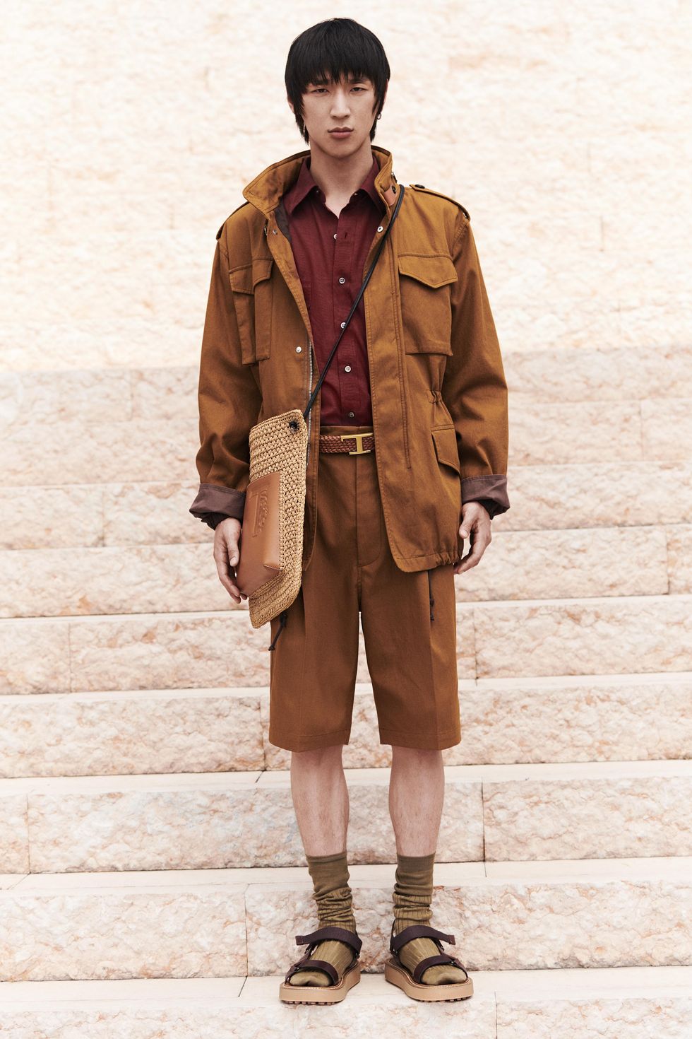 E continua. «Questa stagione ho trovato più importante che in altre l'incontro dell'uomo con la natura rappresentato in questi ragazzi di 5 nazionalità diverse che si incontrano in Toscana, in questo edificio simbolo dell'architettura contemporanea di Mario Botta. E l'idea del sole, della pietra, del mare, della natura sono nate perché da qualche mese è uscito il libro di Peter Bird, fotografo che amo molto da sempre, e informandomi sempre più sulla sua storia, oltre a un grande artista, era un uomo molto elegante e raffinato. Ho amato molto come combina il mondo del safari con il mondo militare e quello super elegante. Rappresenta moltissimo la sofisticatezza su cui sto lavorando da Tod's».