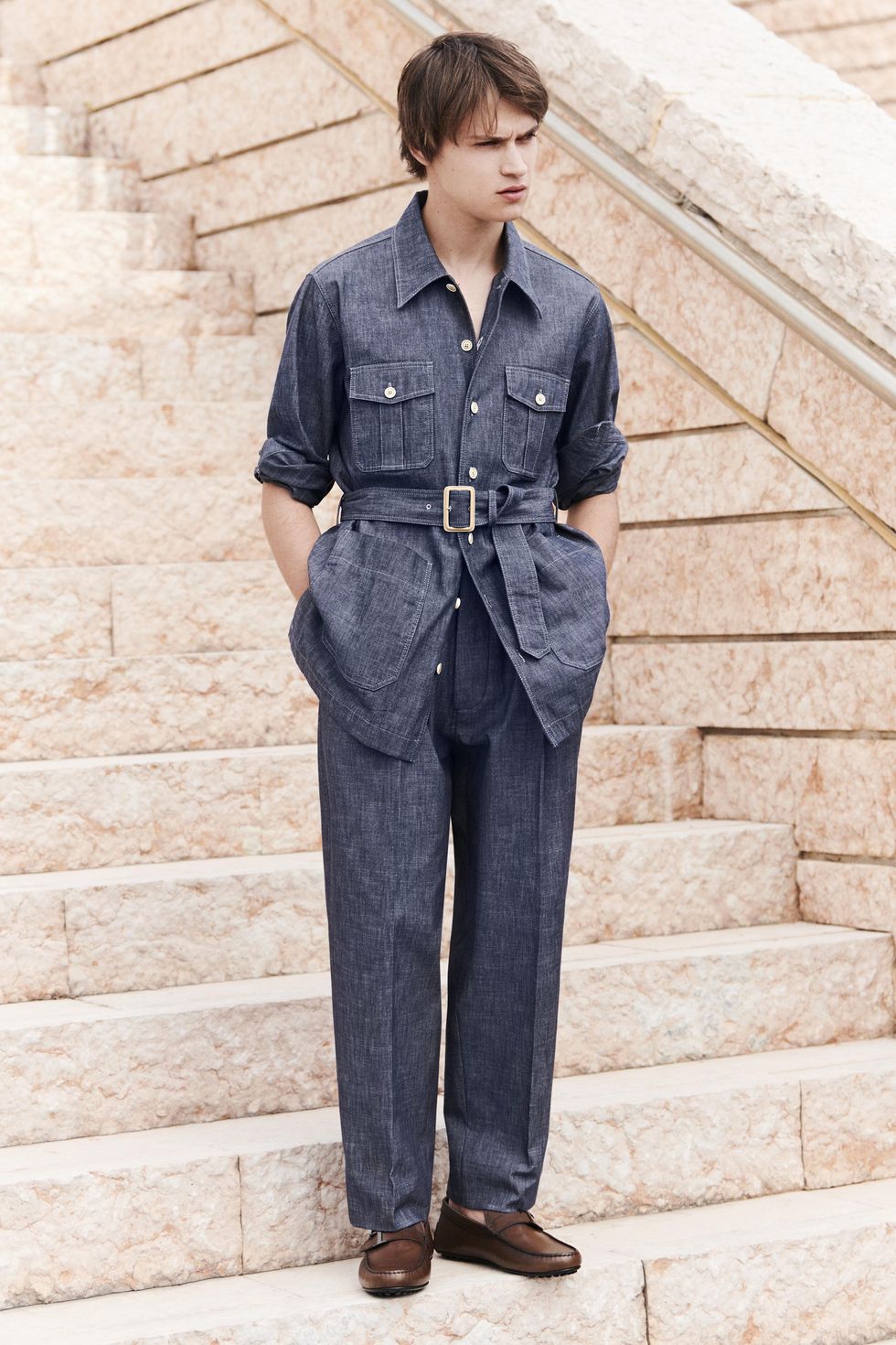E continua. «Questa stagione ho trovato più importante che in altre l'incontro dell'uomo con la natura rappresentato in questi ragazzi di 5 nazionalità diverse che si incontrano in Toscana, in questo edificio simbolo dell'architettura contemporanea di Mario Botta. E l'idea del sole, della pietra, del mare, della natura sono nate perché da qualche mese è uscito il libro di Peter Bird, fotografo che amo molto da sempre, e informandomi sempre più sulla sua storia, oltre a un grande artista, era un uomo molto elegante e raffinato. Ho amato molto come combina il mondo del safari con il mondo militare e quello super elegante. Rappresenta moltissimo la sofisticatezza su cui sto lavorando da Tod's».